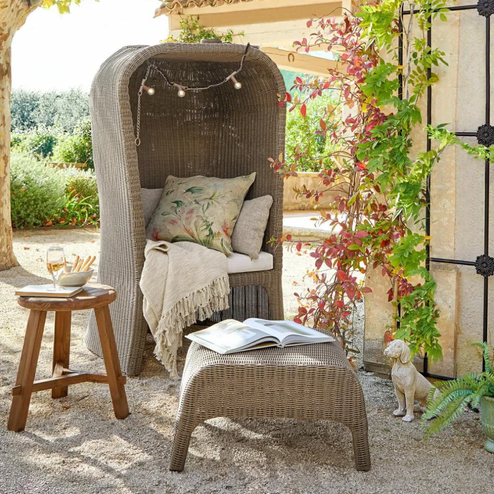 Mit diesem Strandkorb holen Sie sich einen Rückzugsort für entspannte Stunden in Ihren Außenbereich. Das zeitlose Design aus Polyrattan überzeugt durch seine harmonische Form, die ein Gefühl von Geborgenheit schafft. Die hochwertige Verarbeitung wird durch das bequeme Sitzpolster ergänzt, deren Bezug aus strapazierfähigen Olefinfasern nicht nur weich, sondern auch pflegeleicht und langlebig ist. Der praktische Fußhocker kann bei Bedarf genutzt oder platzsparend unter dem Korb verstaut werden – ideal für kleinere Terrassen oder Balkone. Ob im Garten, auf der Veranda oder am Pool, dieser Strandkorb bietet Ihnen ein komfortables Plätzchen, um die Natur zu genießen und den Alltag hinter sich zu lassen.