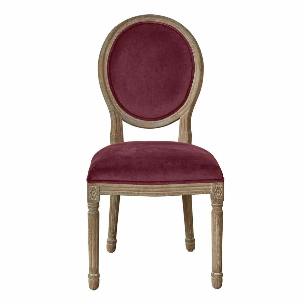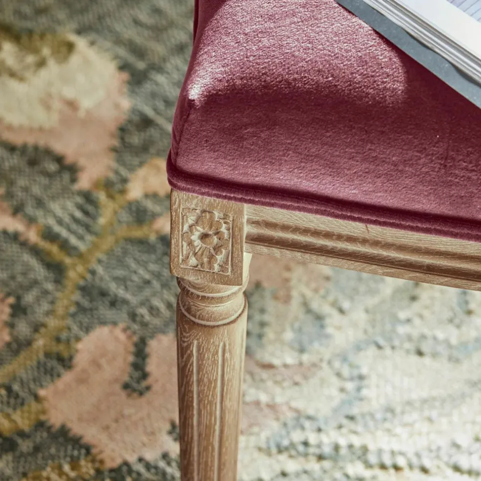 Ein Stuhl, der nicht einfach nur Platz bietet, sondern Geschichte erzählt. Inspiriert vom Stil der französischen Salons zeigt sich dieser Medaillonstuhl mit rundem Rücken, bezogen in einem changierenden, samtweichen Stoff, der je nach Lichteinfall seine Tiefe entfaltet. Der Rahmen aus massivem Eichenholz ist liebevoll geschnitzt und mit einem White-Washed-Finish veredelt, das die natürliche Maserung sanft betont. Ob als Solitär oder in Kombination – dieser Stuhl bringt Charakter in jeden Raum.
