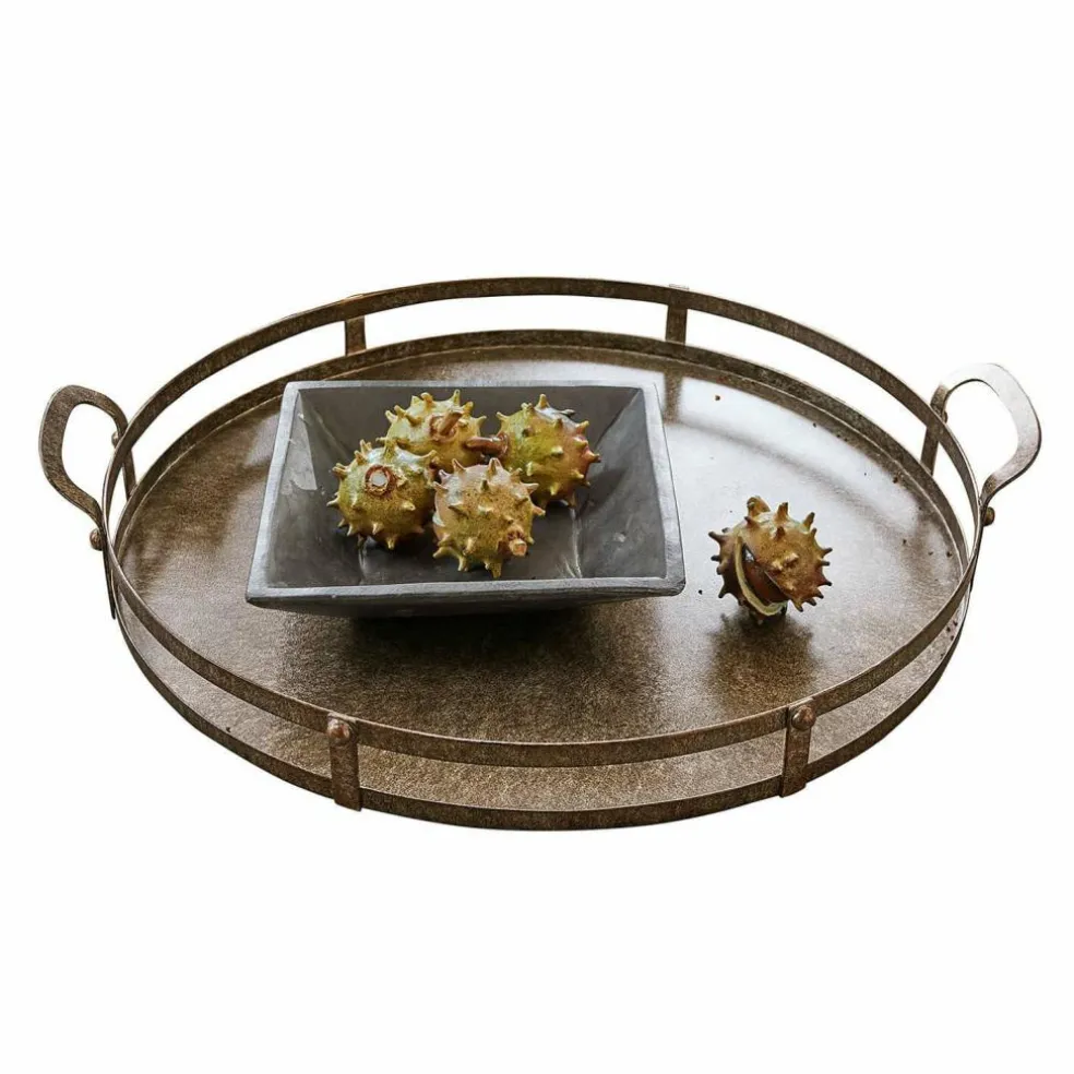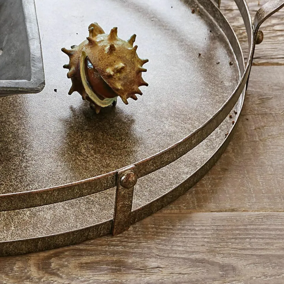 Kaffee, kühle Getränke, Weingläser, Saft, Aperitif, Digestif – ohne ein Tablett wäre das Servieren von Getränken und Co mit viel Lauferei verbunden. Und auch ganz schön stillos. Mit diesem Tablett aber können wir Ihnen eine Servierhilfe vorstellen, die Sie als Gastgeberin auf repräsentative Weise unterstützen wird. Dafür wurde das Tablett aus stabilem Eisen gefertigt und mit einem antikbronzefarbenen, von Hand aufgetragenen Finish veredelt. Als ebenso dekorativ wie praktisch werden sich auch der erhöhte Rand und die beiden Griffe erweisen, mit deren Hilfe Sie das Tablett und seinen Inhalt sicher tragen können. Doch so gerne Sie das stilvolle Accessoire zum Servieren nehmen werden, so sehr lockt es auch, die stattliche Fläche als Basis für Ihre jahreszeitlichen Dekos zu nutzen. Figuren, Kerzen, Pflanzen – lassen Sie Ihrer Kreativität freien Lauf.