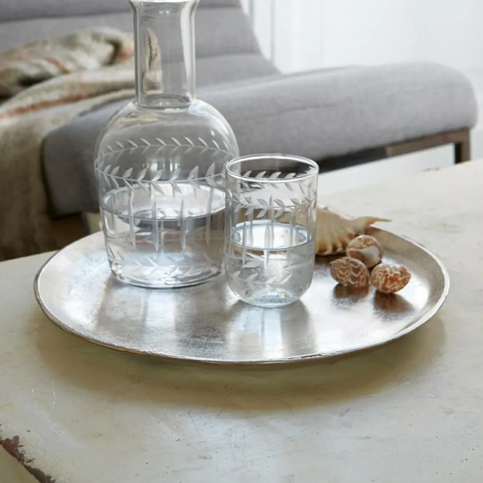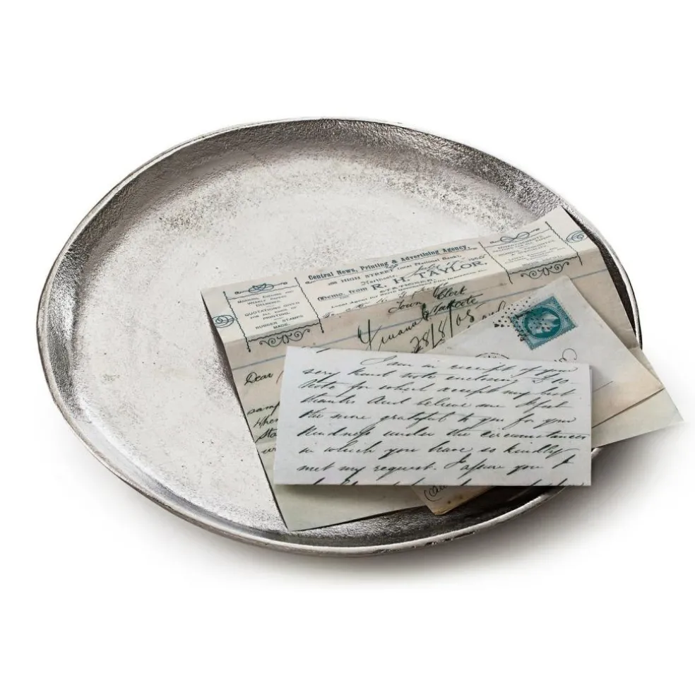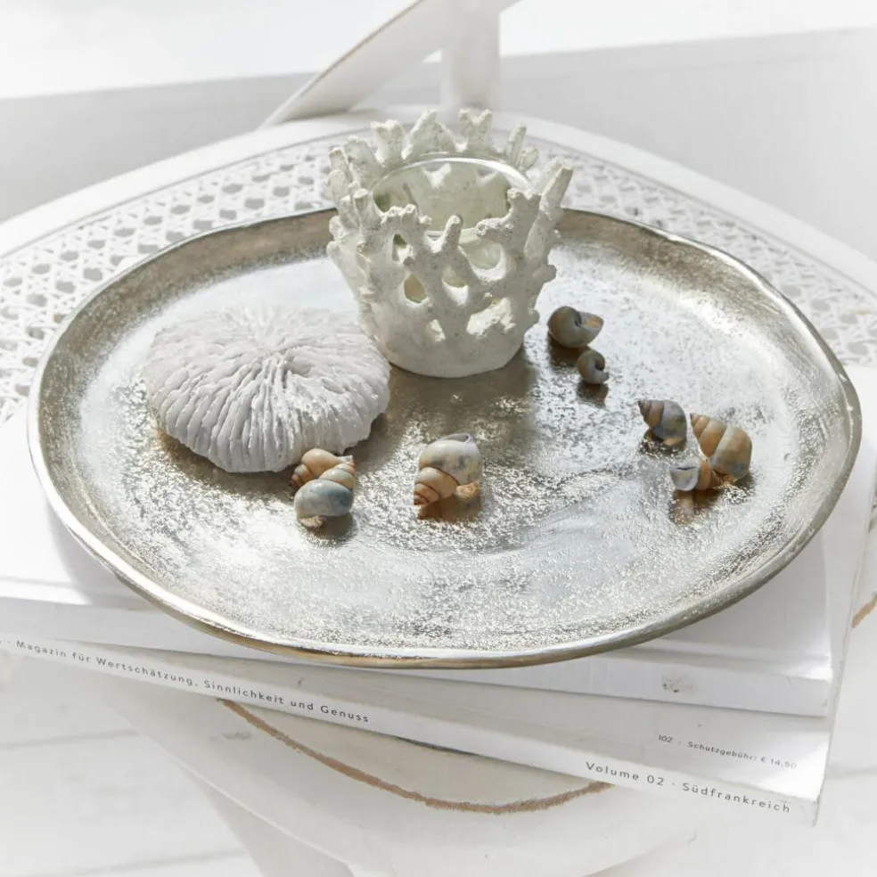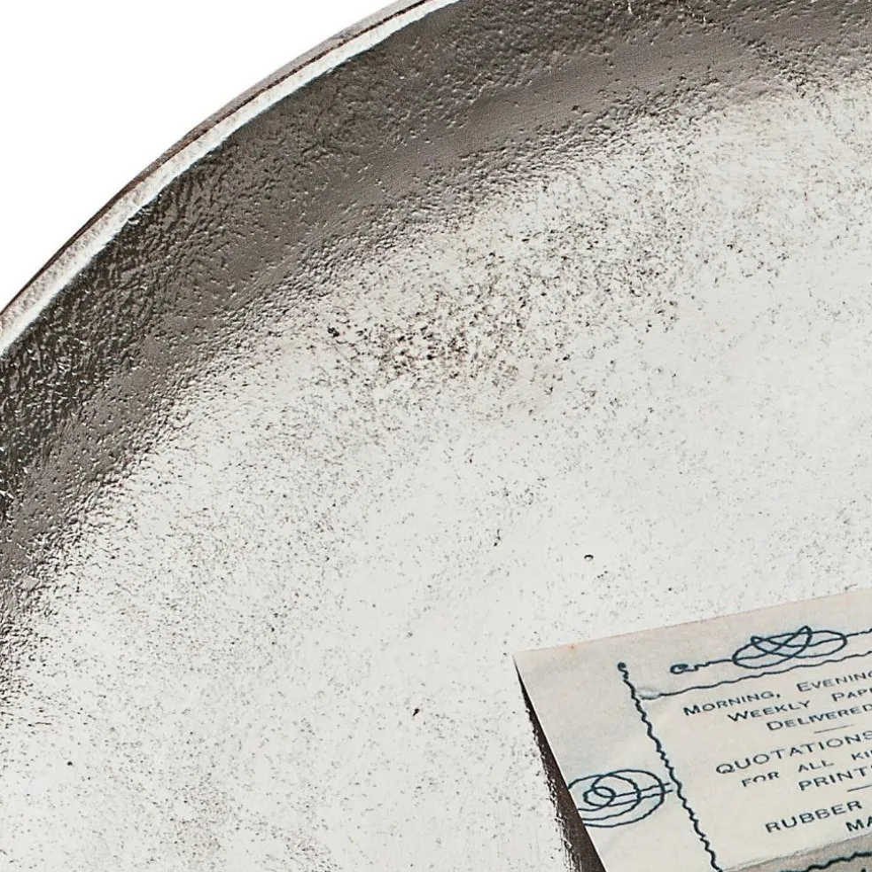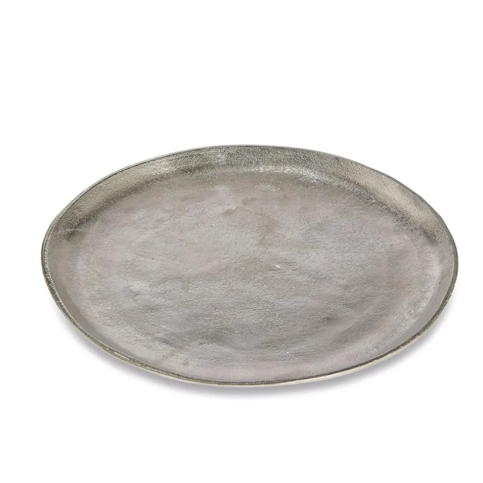 Das kreisrunde Tablett überzeugt durch seine schlichte Schönheit und einen dezenten Glanz. Es wurde aus Aluminium gefertigt und mit einem silbernen Vintage-Finish behandelt. Die charmant gemusterte Oberfläche und die leichten Unregelmäßigkeiten unterstreichen den besonderen Unikat-Charakter dieses hochwertigen Produkts.