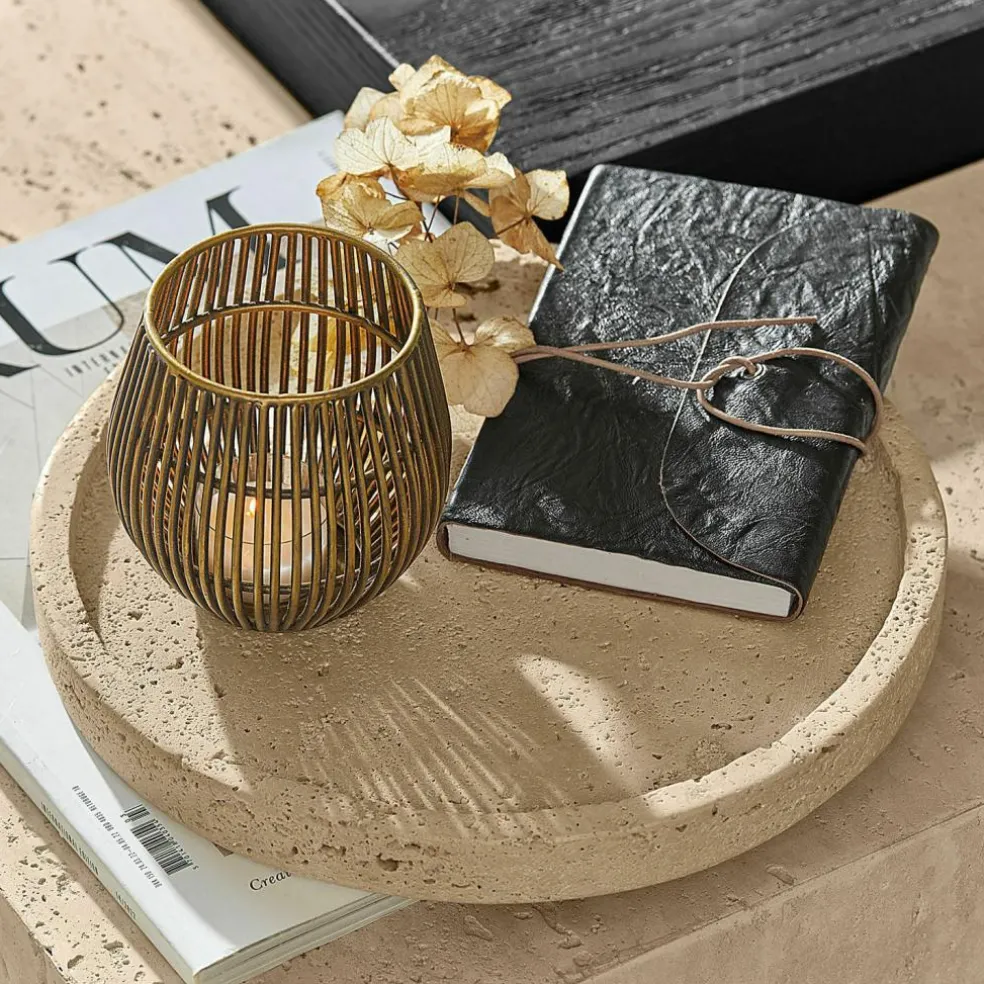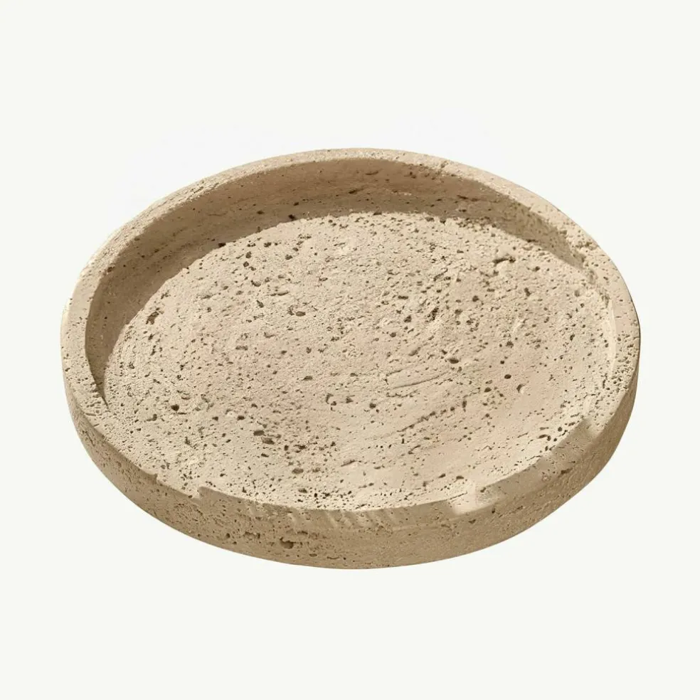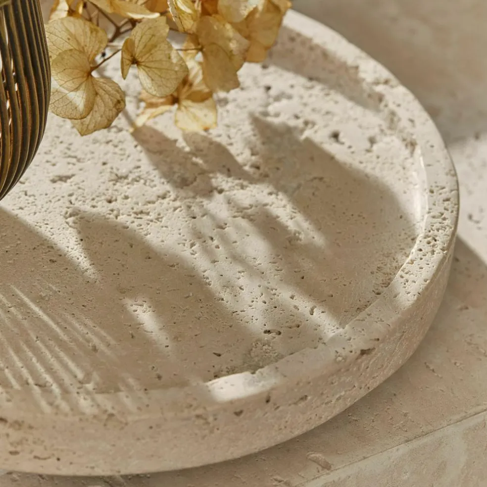 Mit diesem runden Tablett aus Travertin zieht ein Stück Natur in Ihr Zuhause ein. Die charakteristische Porenstruktur verleiht dem Stein eine lebendige Textur, während die sanften Sand- und Beigetöne eine harmonische Wärme ausstrahlen. Ob als stilvolle Ablage für Schmuck, Kerzen oder kleine Wohnaccessoires – dieses Tablett verbindet Funktionalität mit einer natürlichen Ästhetik. Der leicht erhöhte Rand sorgt für Sicherheit und eine schöne Rahmung der platzierten Gegenstände. Jedes Exemplar ist durch die individuelle Maserung des Travertins ein echtes Unikat und bereichert Ihr Interieur mit einem Hauch von zeitloser Schönheit.