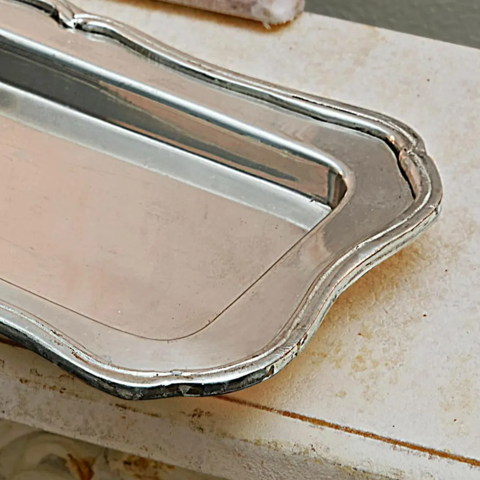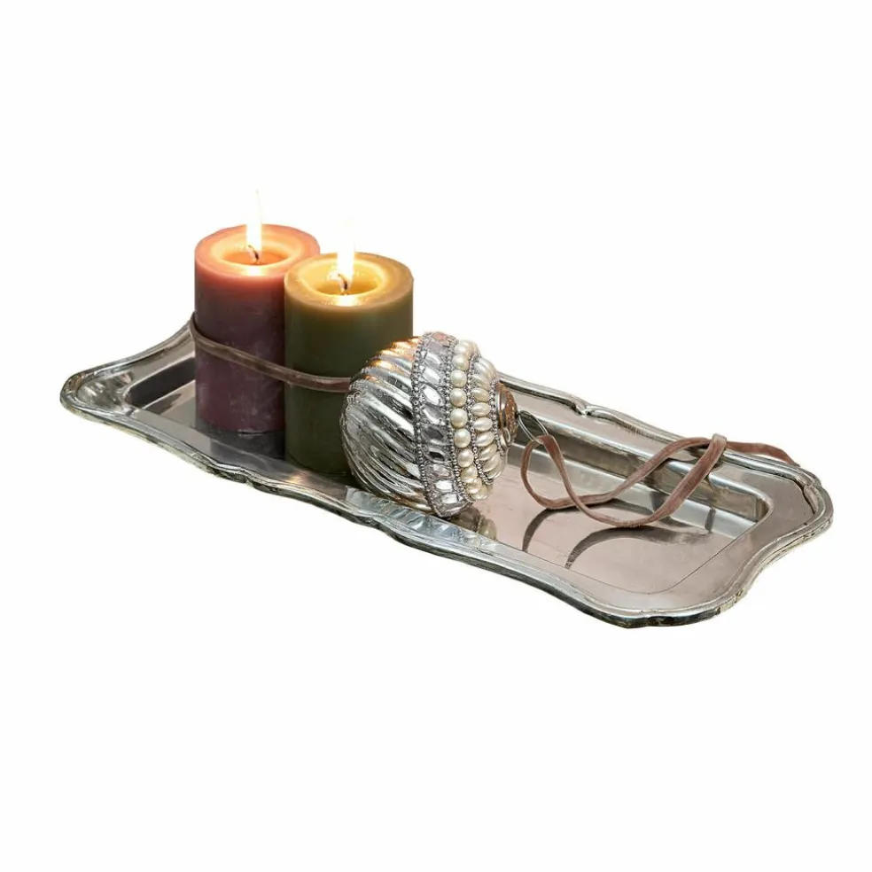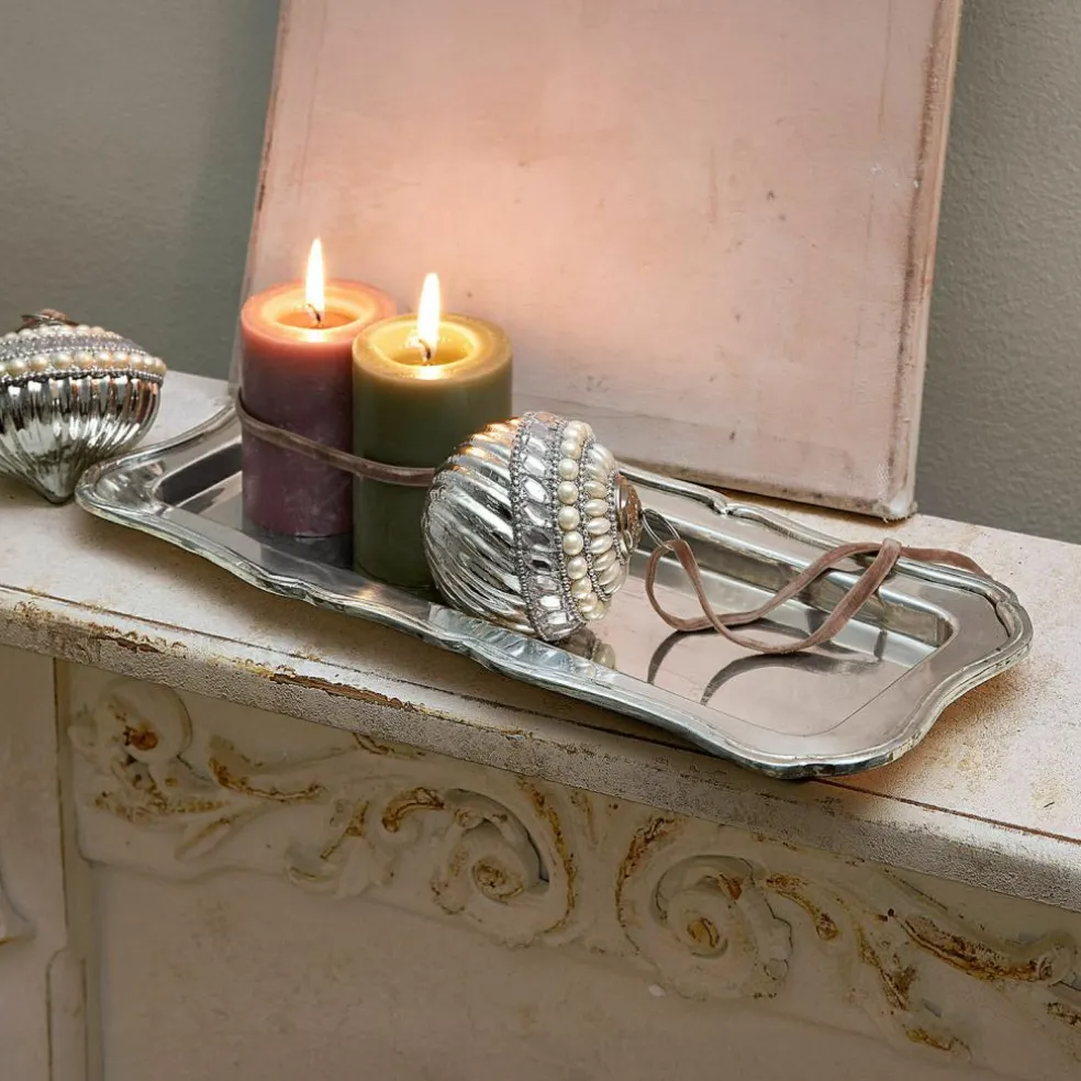 Mit seinem charmanten Antiksilber-Finish erinnert dieses Tablett an die mondänen Zeiten vergangener Jahrzehnte – an silberne Kaffeestunden, liebevoll arrangierte Deko und den Glanz besonderer Anlässe. Die markante Form mit weich geschwungenem Rand verleiht dem Stück Charakter und eine Prise verspielter Eleganz. Das hochglänzende Finish reflektiert das Licht und macht jede Dekoration darauf zu einem kleinen Schauspiel. Ideal, um verpackte Leckereien, Kerzen oder Schmuck stilvoll zu arrangieren – auf diesem Tablett kommt alles zur Geltung, was Ihnen am Herzen liegt.