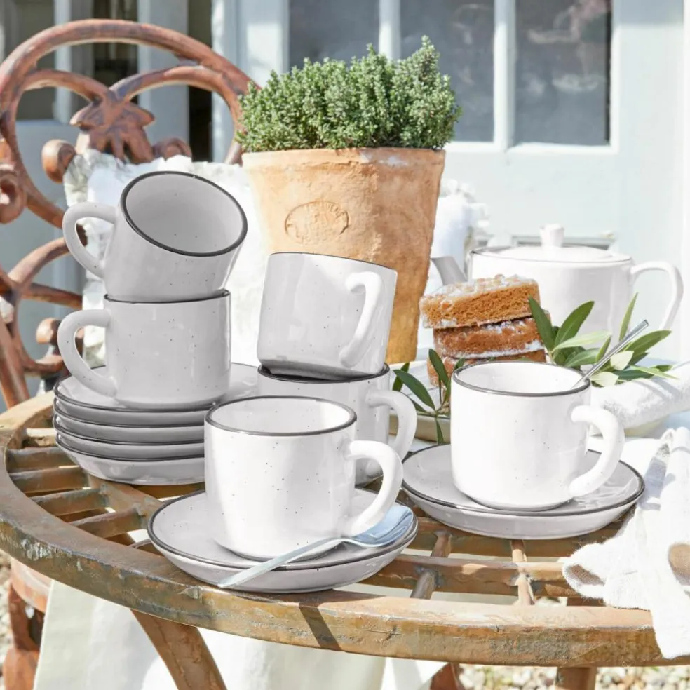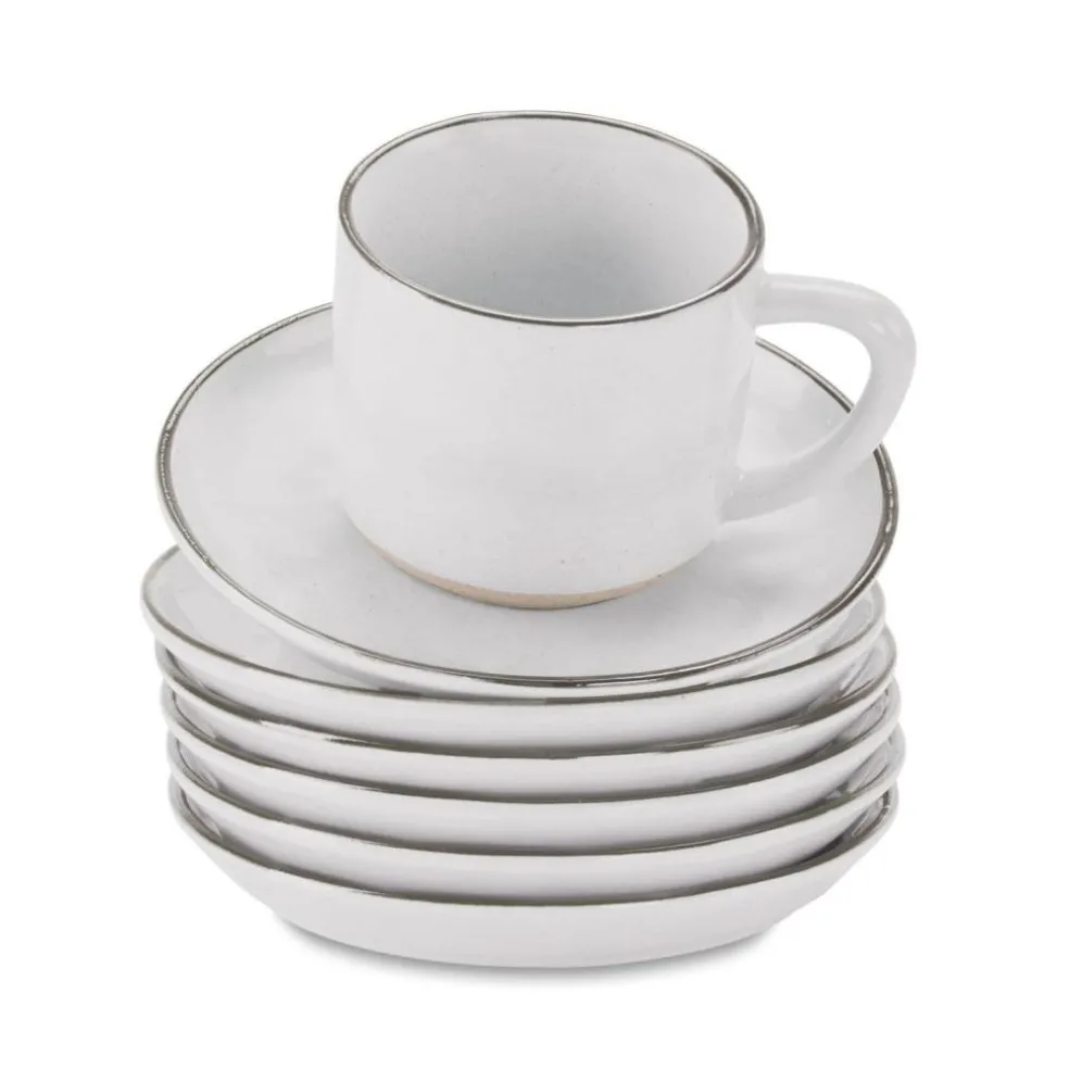 Sechs Schmuckstücke, die aussehen wie von Hand gemacht. Der besondere, gewollt unebene Charakter der edlen Tassen aus Steinzeug gibt ihnen individuellen Charme. Sie sind glänzend glasiert, außer am Boden, und haben einen dunklen Rand oben. Der mediterrane Charakter entführt Sie bei Tisch unter südliche Sonne und lässt uns von Spanien oder Italien träumen. Die Untertassen sind auch schon im Set enthalten. Genießen sie hieraus den ersten Kaffee am Morgen, einen Eistee oder auch Obst, Müsli, Eiscreme oder Joghurt. Für die große Runde mit Freunden oder der ganzen Familie erhalten Sie ein geschmackvolles, dezentes Set, das jede Tafel adelt. Drinnen wie draußen erleben Sie hiermit zu jeder Jahreszeit echte Gemütlichkeit und ein Gefühl der Entschleunigung, wenn Sie sich bewusst einfach nur einem Getränk oder einer kleinen Speise widmen.