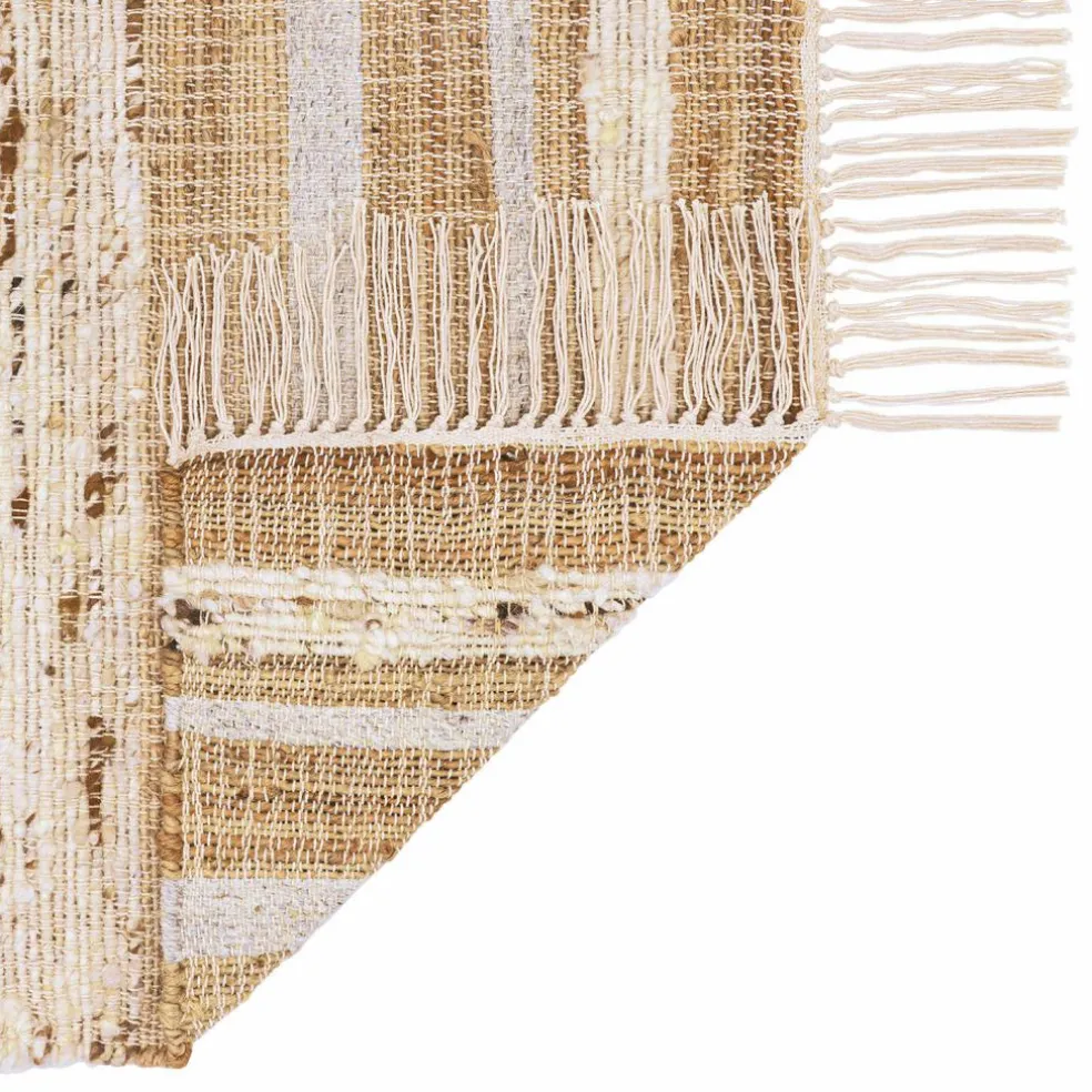 Dieser Teppich begeistert nicht nur durch seinen natürlichen Look, er präsentiert sich auch als echter Charakterdarsteller. Das verdankt er seinem hochwertigen Materialmix aus Jute, Wolle und Baumwolle. Die traditionelle Handwebart und die unterschiedlichen Texturen in harmonischer Farbabstimmung lassen das schöne und lebendige Streifenbild entstehen. Der Teppich gibt sich äußerst robust und ist dank seines hohen Wollanteils angenehm weich in der Haptik. Für einen schönen Abschluss sorgen die Fransen an den schmalen Kanten. Ein behaglicher Wohnakzent, der sich mit einem Landhaus-Interieur ebenso gut ergänzt wie mit einer Einrichtung im Bohemian-Look. Jedes Stück ist ein Unikat, denn kein Modell gleicht dem anderen.