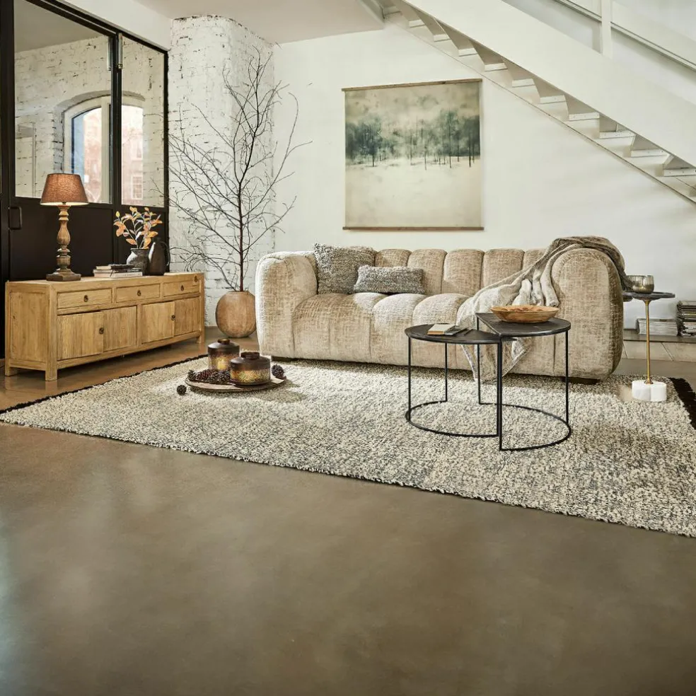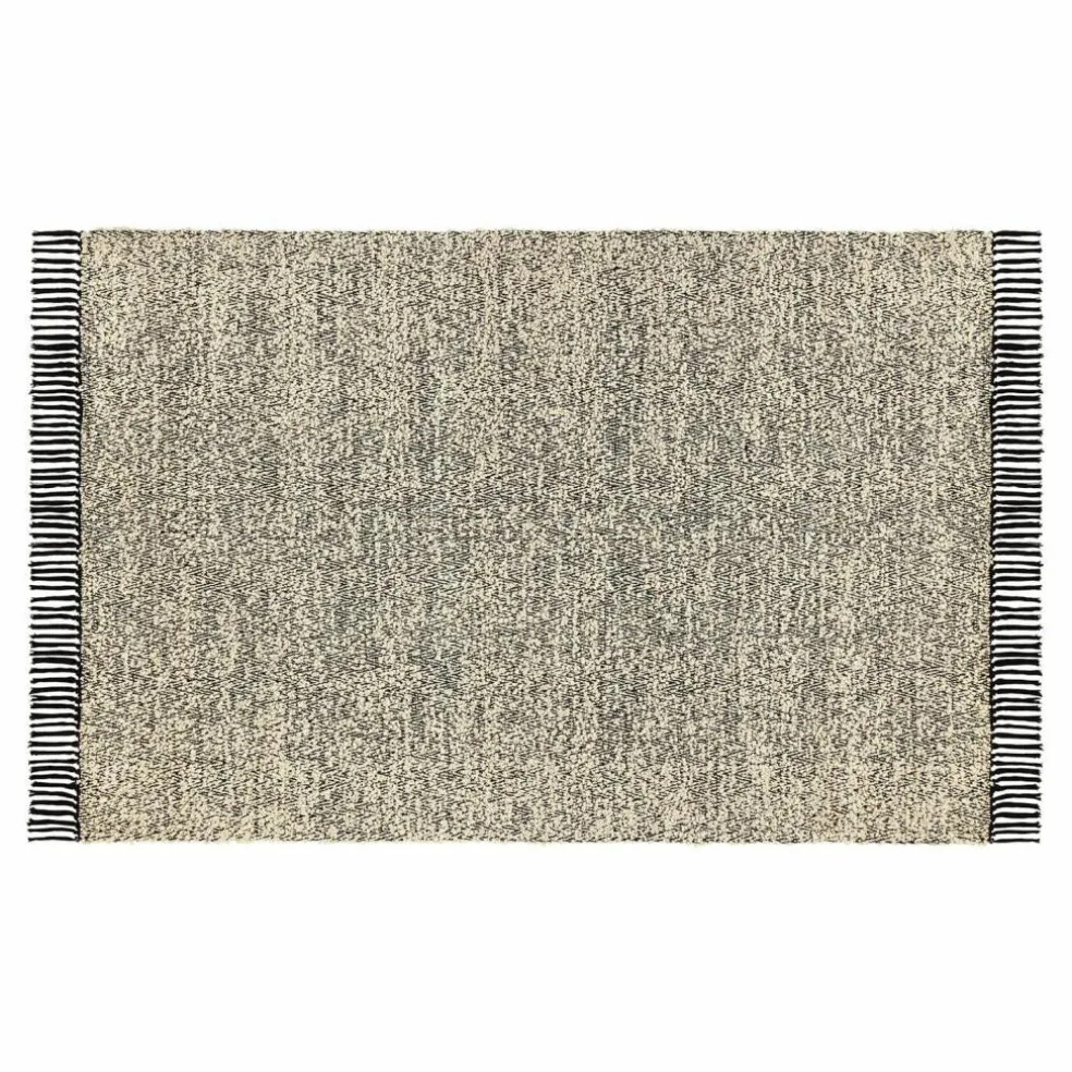 Dieser exquisite handgewebte Teppich besticht durch seine Schwarz-Weiß-Musterung und die auffälligen, schwarzen Fransen an den kurzen Seiten. Die fein gearbeitete Textur und die weiche Haptik sorgen für ein angenehmes Gefühl unter den Füßen. Die einzigartige Kombination aus Schlaufenfransen an den langen Seiten und langen Fransen an den kurzen Seiten verleiht dem Teppich einen stilvollen und modernen Look. Die Rückseite aus Baumwolle bietet zusätzliche Stabilität und Komfort.