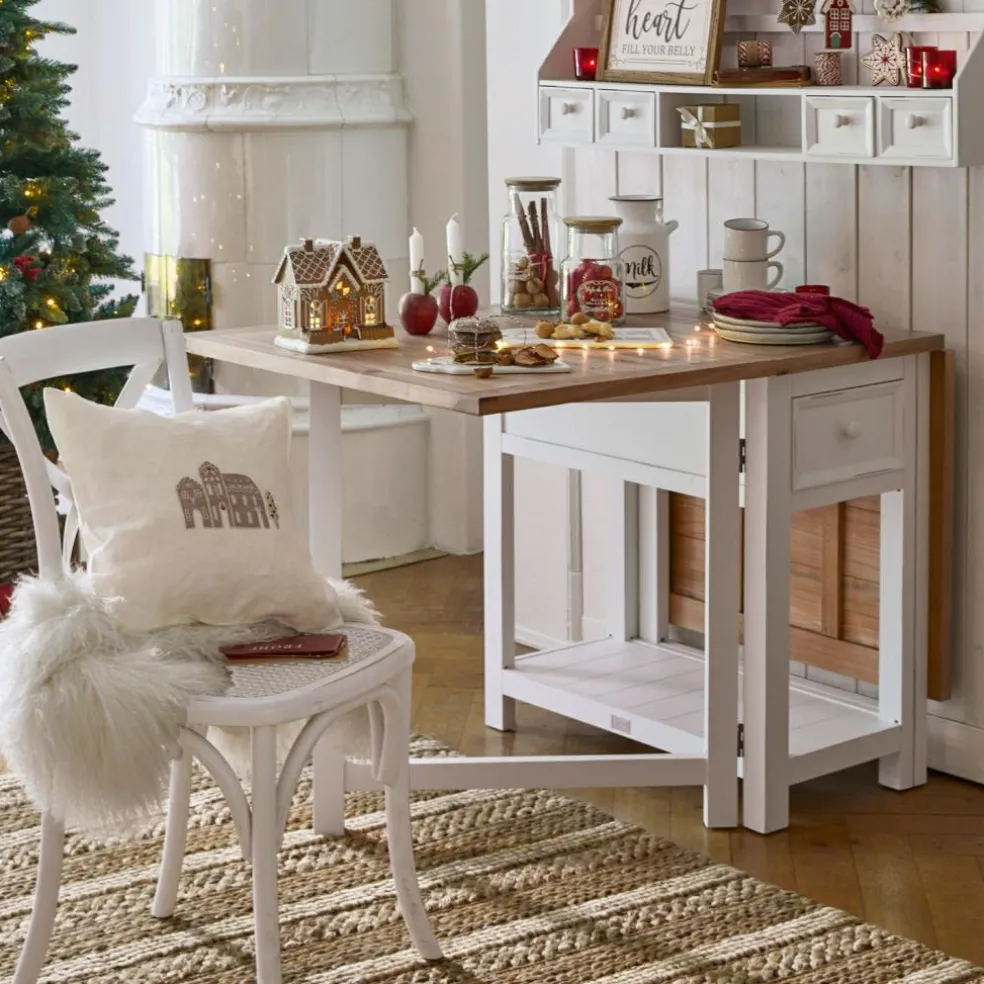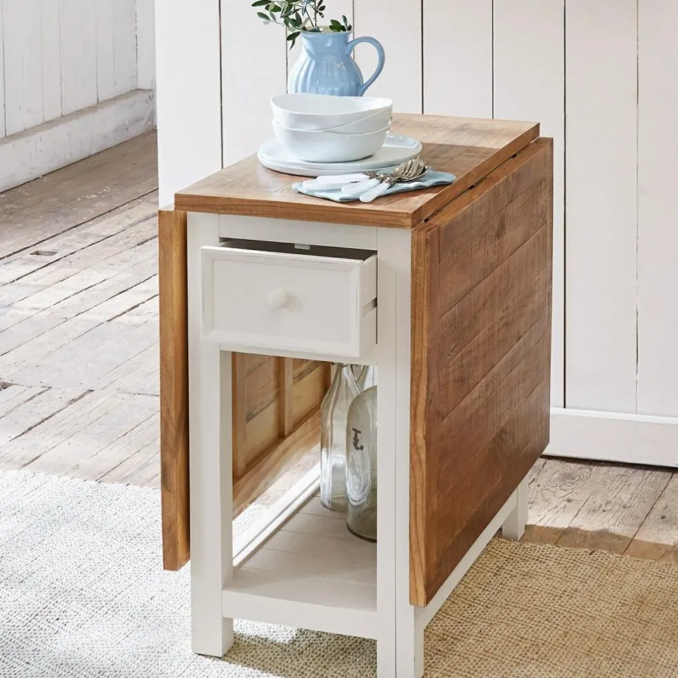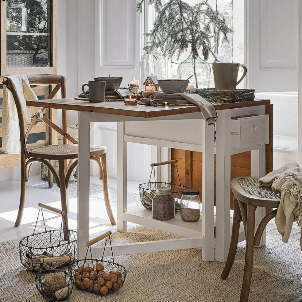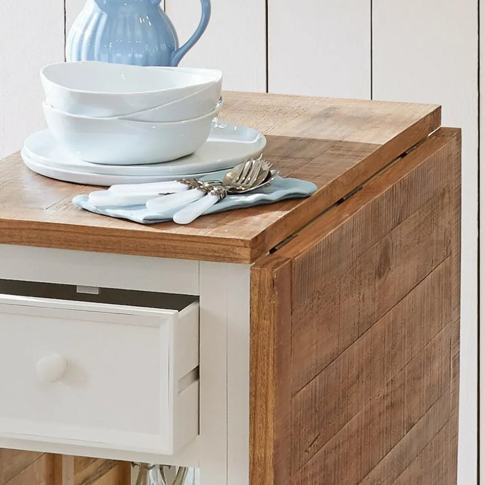 Bei diesem traumhaften Stück mit hochwertigem Tannenholz treffen vollendetes Design und gut durchdachte Funktionalität aufeinander. Wenn Sie etwas mehr Fläche benötigen, können Sie die Tischplatte hochklappen. So haben Sie schnell mehr Fläche, wenn die Runde größer wird oder mehr Arbeitsfläche gefragt ist. In der Schublade und auch auf dem Ablageboden können Utensilien verstaut werden, die Sie gerne griffbereit haben möchten. Das Antik-Finish schmeichelt dem Auge und macht dieses Möbelstück zum zauberhaften Highlight in Räumen im Landhaus-Stil oder im beliebten Country-Chic. Ein zeitlos schönes Objekt, das sich perfekt dem Ambiente anpasst.