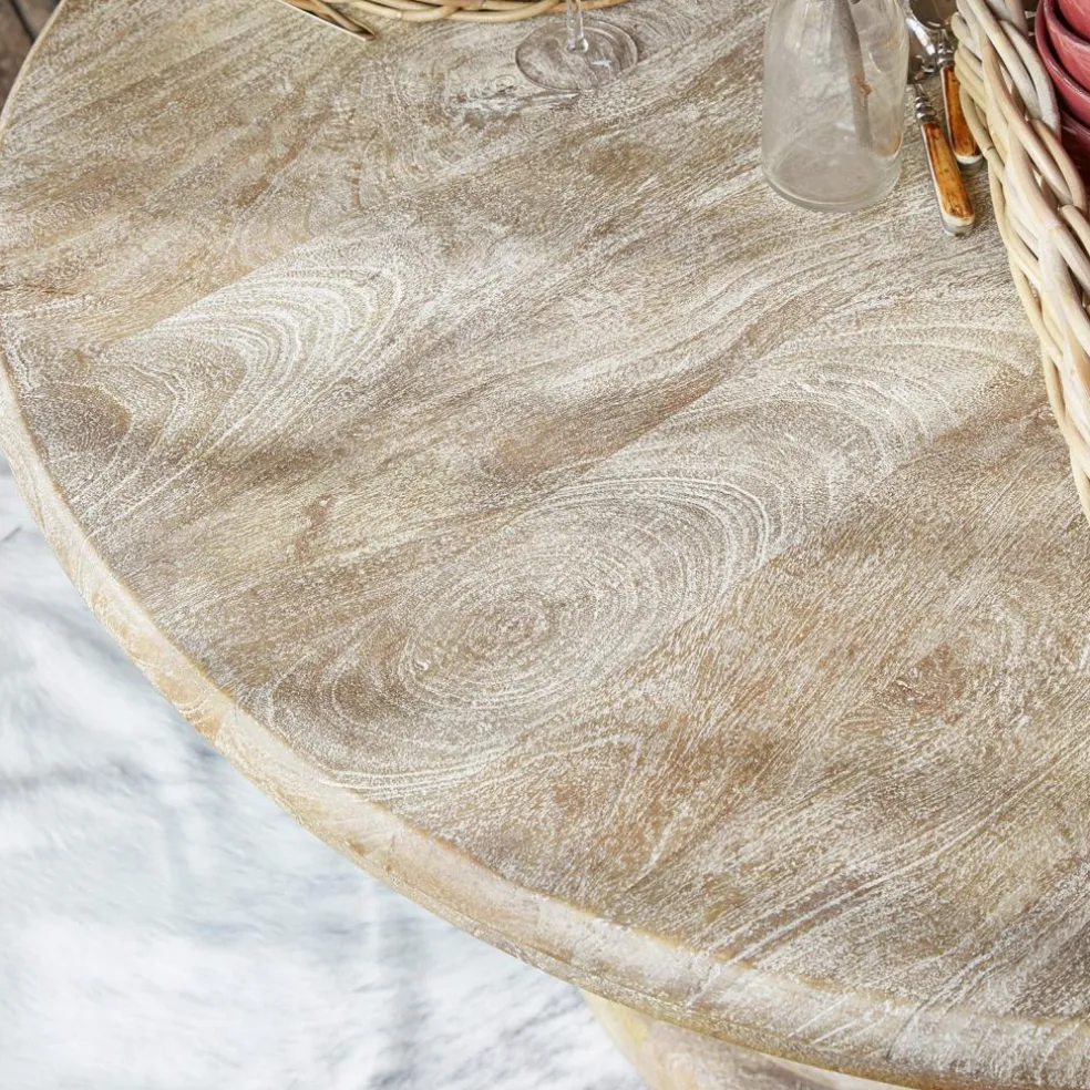 Wissenschaftler haben es längst bewiesen: Ein runder Tisch wird schneller und zwangloser zum geselligen Mittelpunkt einer Wohnung als oftmals ein eckiger. Die lockere Sitzordnung wird als besonders gemütlich empfunden, so dass alle gleich entspannt plaudern, sobald sie Platz genommen haben. Zum sonntäglichen Familien-Brunch, zum festlichen Dinner mit Freunden, zur ausgelassenen Spielerunde mit den Kindern und, und, und. An einem runden Tisch kann man im Ernstfall auch mal näher zusammenrücken und noch einen weiteren Stuhl bzw. einen Gast unterbringen. Außerdem fügt sich ein runder Tisch spielend leicht in jeden Interieur-Stil, passt zum klassisch eleganten Stil und scheut auch nicht die Nähe zu modern kantigen oder betont puristischen Einrichtungsgegenständen. Denn dieser Tisch ist eine gereifte Persönlichkeit, die sich überall selbstbewusst behauptet. Die massive Platte mit dem fein gearbeiteten Rand ruht auf einem imposanten Fuß, der an antike Säulen erinnert. Für diesen Tisch musste der Kunsthandwerker sein ganzes Können in die Waagschale werfen, um das edle Mangoholz so kunstfertig und detailreich zu bearbeiten. Das Ergebnis ist ein Meisterwerk, das an die großen Tische in noblen Herrenhäusern erinnert, die dort Jahrzehnt um Jahrzehnt standen und Generationen an sich haben vorbeiziehen sehen. Die wunderschöne Patina unterstreicht den antiken Charakter des Tisches.
