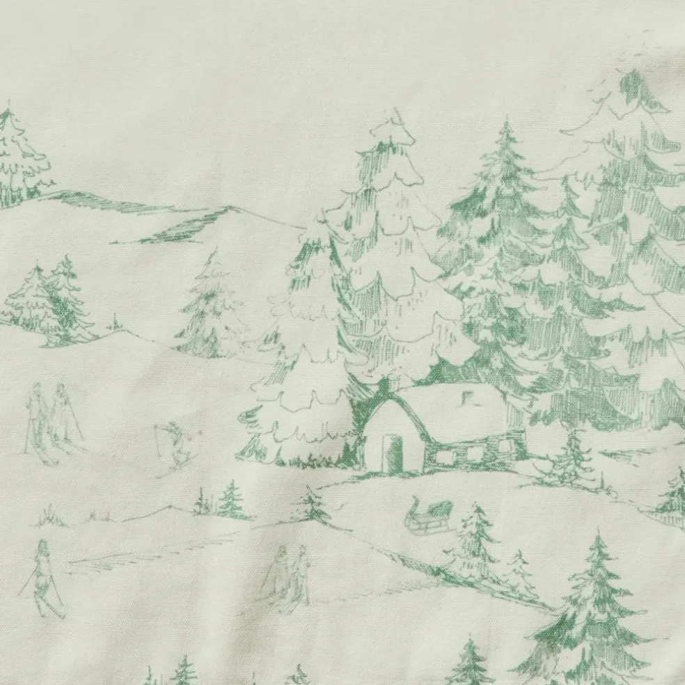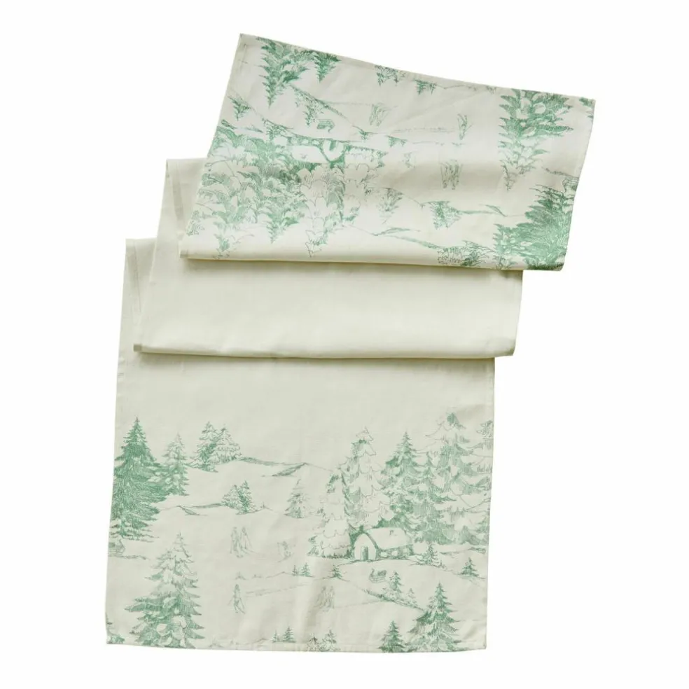 Wie ein stiller Blick aus dem Fenster an einem friedlichen Wintermorgen wirkt dieser Tischläufer mit seinem feinen, waldgrünen Druck. Die weiche Baumwolle unterstreicht die natürliche Anmutung des gewebten Stoffes, während das detailreiche Motiv an verschneite Berghänge, einsame Waldhütten und stille Nadelwälder erinnert. Ob für das Sonntagsfrühstück oder die gedeckte Festtafel – dieser Läufer schenkt Ihrer Tischdekoration eine ruhige, fast poetische Kulisse. Besonders schön entfaltet sich das Motiv an beiden Enden und lässt gleichzeitig die Mitte schlicht und offen wirken – ideal, um Accessoires, Vasen oder Geschirr darauf zu arrangieren.