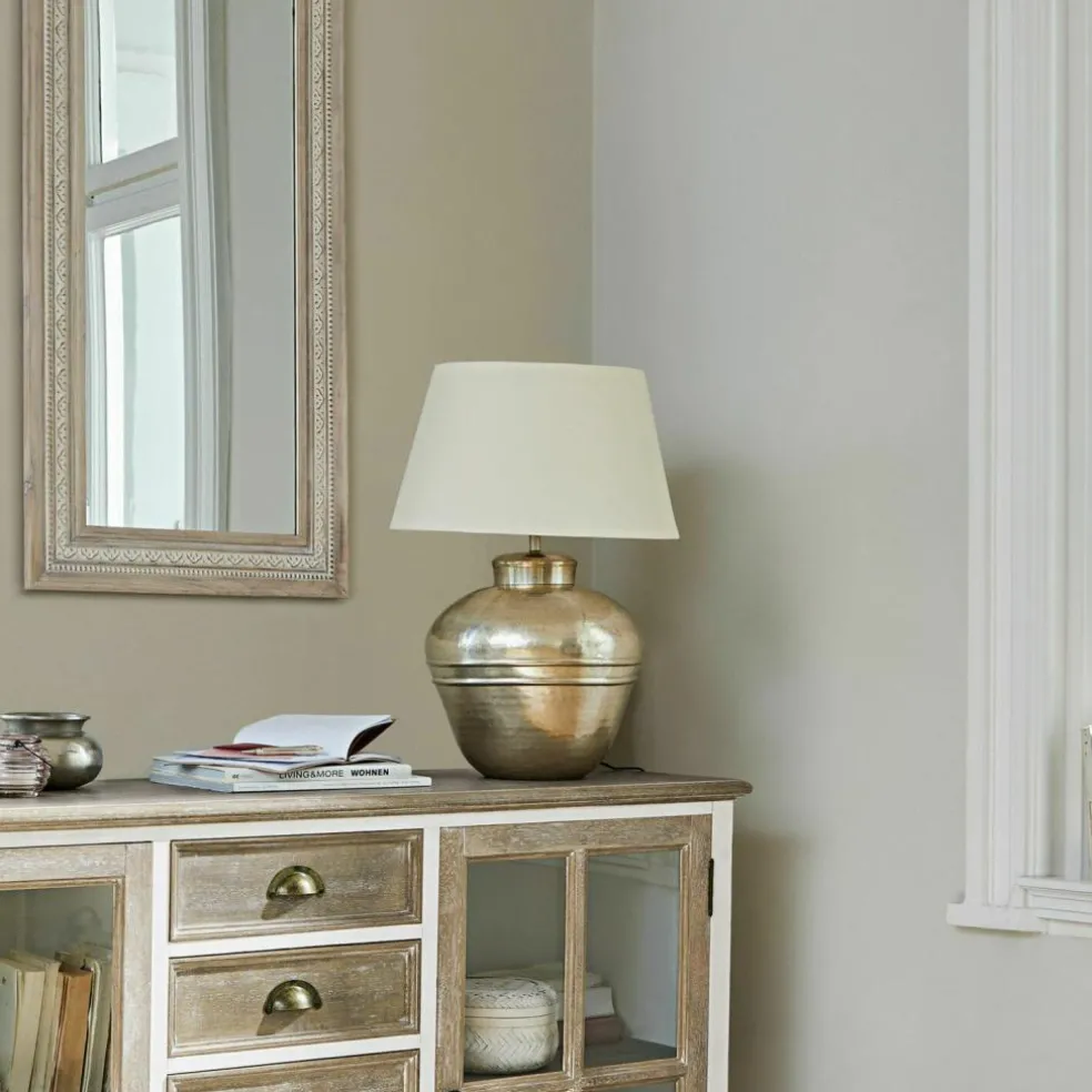 Der aufwendig in Hammerschlag-Technik gearbeitete Lampenfuß aus reinem Messing wird dank des eleganten Finishs in Antiksilber zum buchstäblichen Highlight Ihrer Einrichtung. Und das Beste: Keine Tischlampe ist wie die andere, denn echte Handarbeit macht jedes Stück zu einem Unikat. Der schnörkellose, cremefarbene Lampenschirm aus 100 % Baumwolle setzt dem edlen Look schließlich die Krone auf. Schön zu einer klassischen Einrichtung oder einem Ambiente im Long-Island- oder Landhaus-Chic.