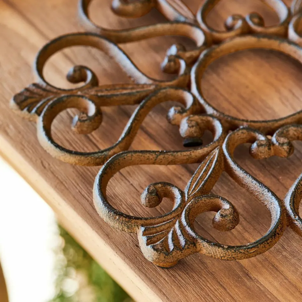 Dieses attraktive Set umfasst zwei Untersetzer aus schwerem Gusseisen. Die geschwungene Formen im Ornament-Stil unterstreichen den authentischen Vintage-Charakter. Das hochwertige Material speichert Wärme und hält darauf abgestellte Töpfe länger auf der gewünschten Temperatur. Gleichzeitig werden die Oberflächen Ihrer Möbel vor Hitzeschäden bewahrt. Auch als Untersetzer für Blumentöpfe sind die gusseisernen Schmuckstücke bestens geeignet. Kurz: Ein wunderschönes und überaus vielseitiges Wohn-Accessoire – nicht nur für Fans des rustikalen Landhausstils.