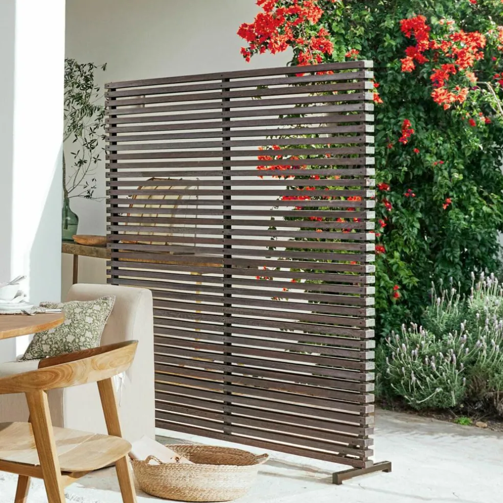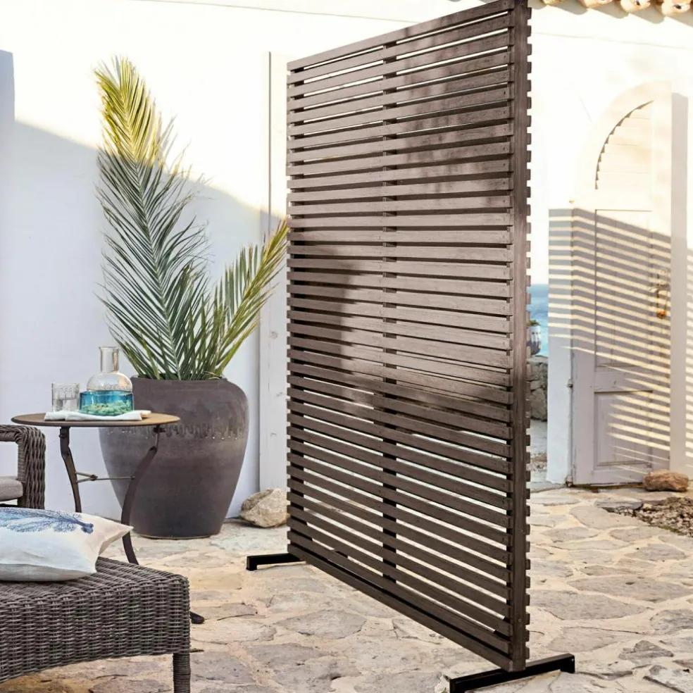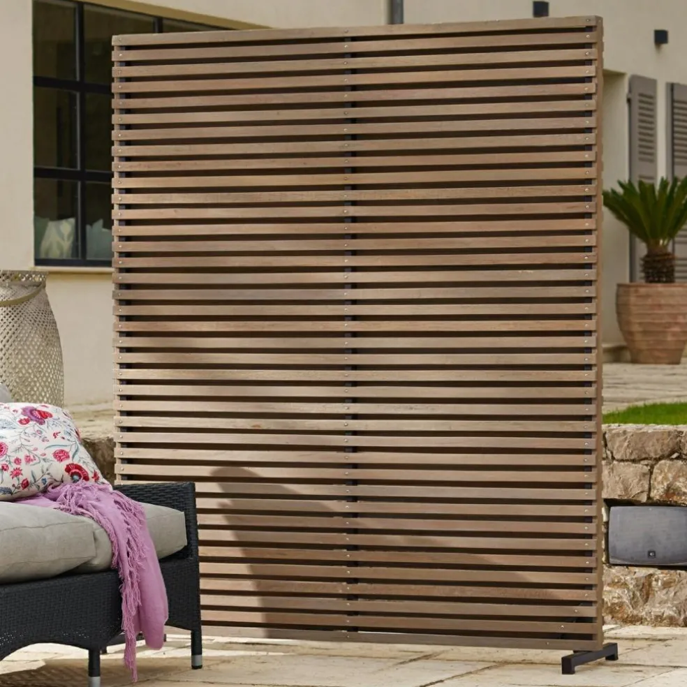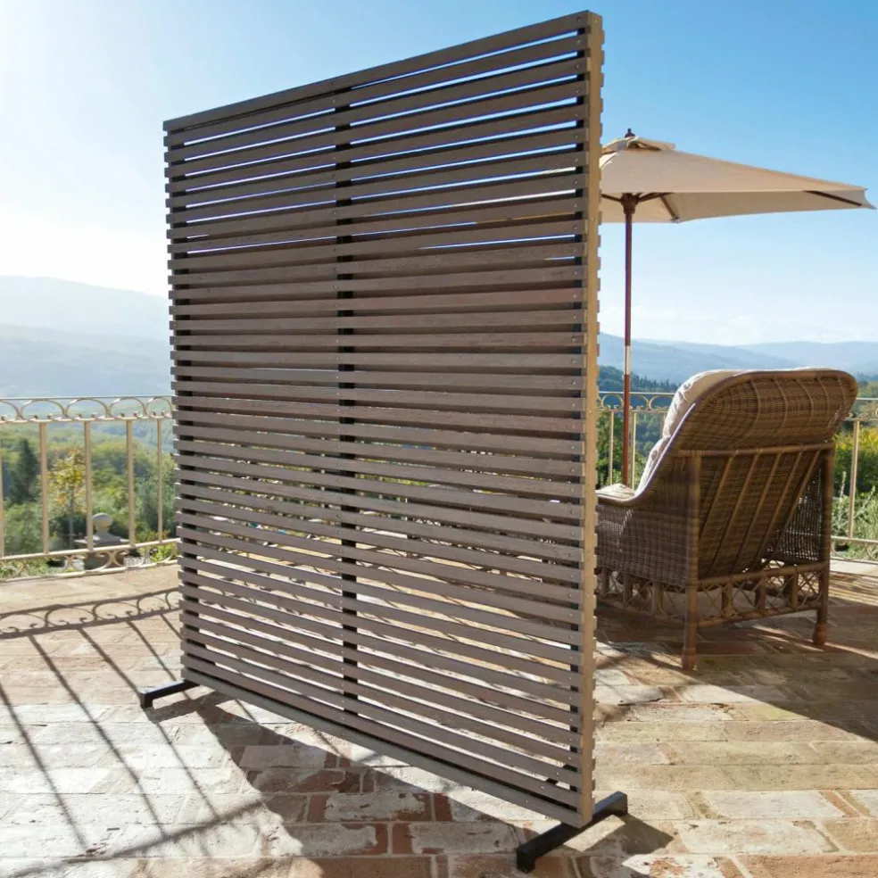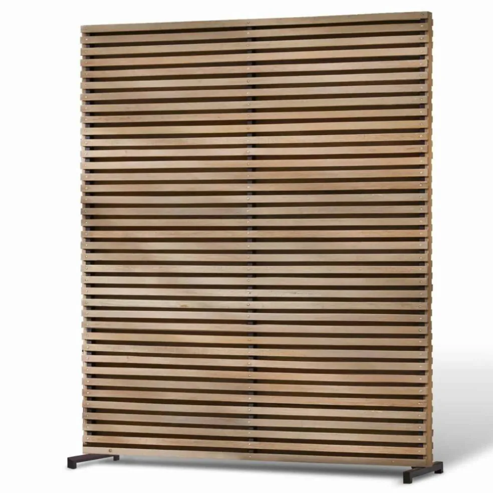 Sie möchten sich vor den Blicken der Nachbarn zurückziehen oder sich auf Ihrer Terrasse ein privates Séparée einrichten ohne zuvor große Umbaumaßnahmen vornehmen zu müssen. Die Alternative ist eine Sichtschutzwand. Diese erfreuen allerdings nicht immer das Auge des Betrachters. Bis jetzt, denn hier gibt es eine Trennwand in höchst gelungenem und qualitativ hochwertigem Design. Die Wand ist aus feinen Kempasholzleisten gefertigt und somit von beiden Seiten gleichermaßen ansehnlich, sowie äußerst robust und widerstandsfähig. Die standsicheren Füße sind aus rostfreiem Aluminium hergestellt. Praktisch und flexibel so lässt sich die Funktionalität der Trennwand zusammenfassen. Denn dadurch, dass Sie nicht montiert wird, kann sie problemlos ihren Einsatzort wechseln. Je nachdem, wo Bedarf ist.