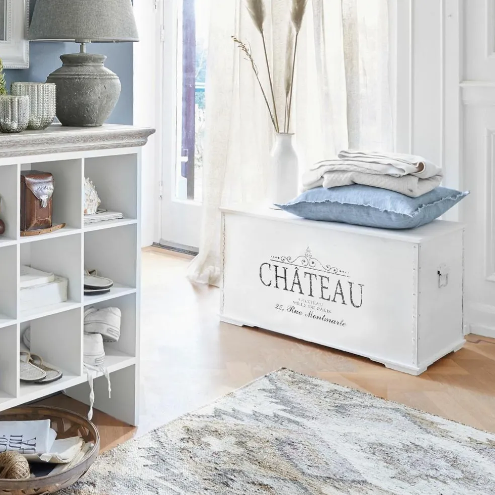 Es muss sich um einen besonders edlen Tropfen gehandelt haben, der in dieser Kiste aus der berühmten Schlosskellerei geliefert wurde. Vielleicht war es ein exklusiver Jahrgangs-Champagner für einen besonderen Anlass? Denn damals wie heute steht das Öffnen einer Champagnerflasche und der Genuss des perlenden Getränks für einzigartige Momente im Leben. Und gehört auch das rauschende Fest längst der Vergangenheit an, so sind die Transportkisten immer noch in Gebrauch – jetzt als praktische Truhe im 2er Set. Denn stabile Kisten wie diese hier verfügen über viele Talente. Neben dem sicheren Transport kostbarer Güter dienen sie am Bestimmungsort auch gerne als praktischer Stauraum. Aber bitte nicht im Keller, dafür ist die Truhe im 2er Set viel zu schade. Mit dem nostalgischen Chateau-Schriftzug, der hübschen Zierleiste und den liebenswerten Spuren eines arbeitsreichen Lebens ist sie ein originelles Schmuckstück, das sich gerne auch im Wohnraum nützlich macht. Beide Kisten haben an einer Seite Scharniere, so dass sich der Deckel bequem öffnen lässt und die verschiedensten Dinge darin verstaut werden können. Ob solo oder als eingespieltes Duo ersetzt die Truhe im 2er-Set den Couch- und Beistelltisch, sie passt aber auch perfekt neben ein Bett im Landhaus-Stil.