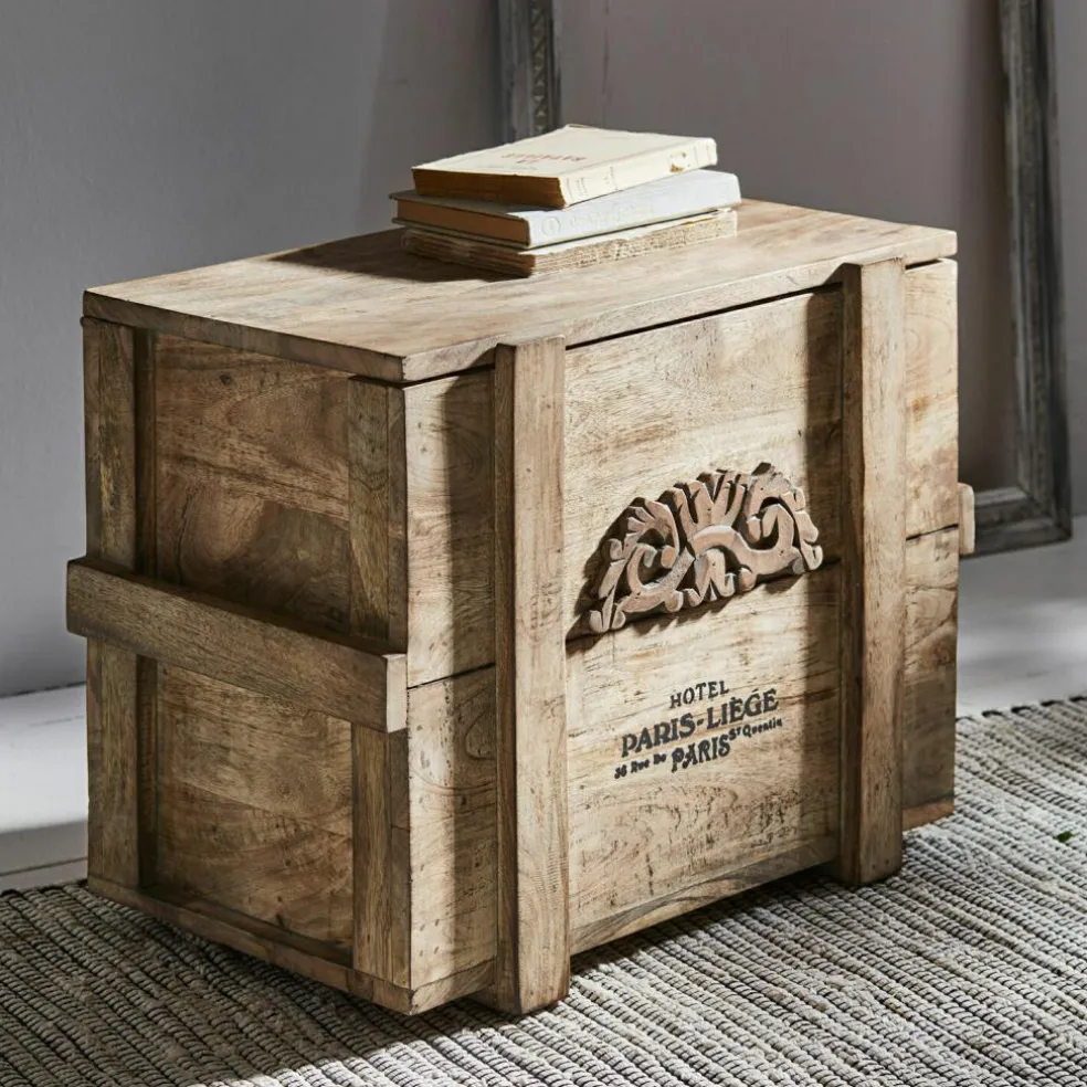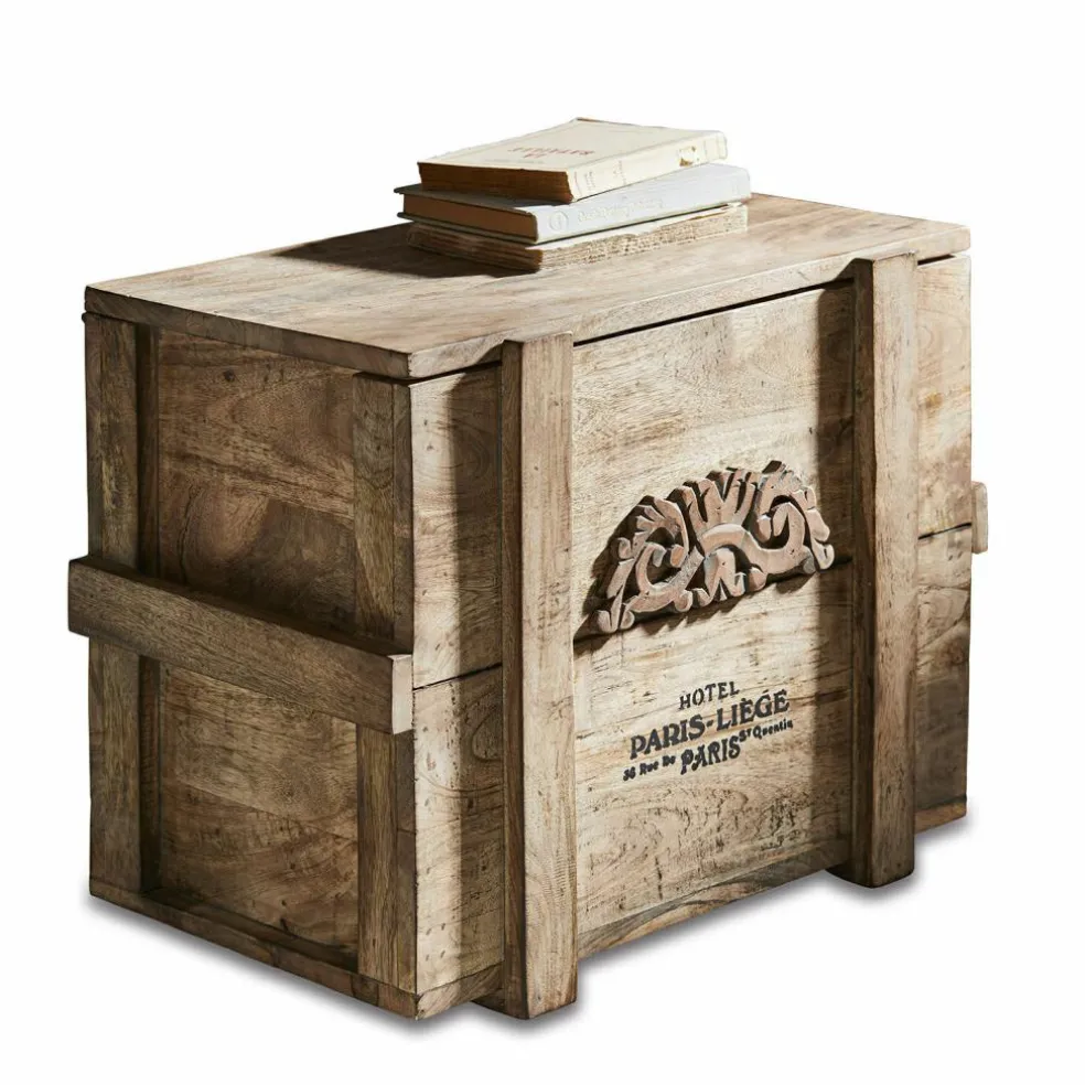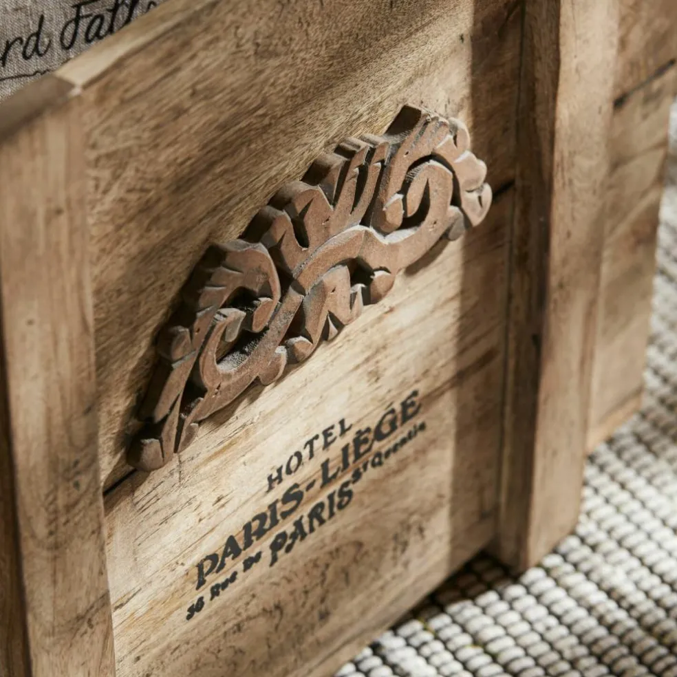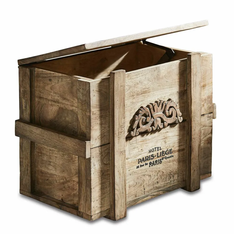 Was für eine verlockende Vorstellung: Man stöbert auf Großmutters Dachboden und entdeckt plötzlich diese Truhe! Schon die Tatsache, dass sie aus massivem Holz besteht, zeigt deutlich, dass sie nicht aus jüngster Zeit stammt und auch der nostalgische Schriftzug mit dem Emblem scheint weit in die Vergangenheit zurückzuführen. Dann öffnen Sie vorsichtig und mit etwas Herzklopfen den Deckel der Truhe … und entdecken darin vielleicht eine alte Porzellanpuppe und ein Bündel Briefe, die mit einem rosa Bändchen und mit einem vertrockneten Veilchenstrauß geschmückt sind. Ob das Großmutters Puppe war? Und die ersten Liebesbriefe, die sie als junges Mädchen von einem heimlichen Verehrer bekam? Auf jeden Fall ist es diese Truhe wert, bald als nostalgisches Schaustück in Ihrem Wohn-Interieur präsentiert zu werden. Im Eingangsbereich des Hauses, im Wohnraum oder auch im Schlafzimmer. Eben überall dort, wo Sie Stauraum mit antiker Ausstrahlung zu schätzen wissen. Und wann immer Sie den Deckel der Truhe öffnen, um etwas herauszuholen oder hineinzulegen, können Sie sicher sein, dass er nicht unkontrolliert herunterfallen wird, denn die Truhe ist mit einem Mechanismus ausgestattet, der das verhindert. Aus edlem Mangoholz gearbeitet, mit antiker Patina.