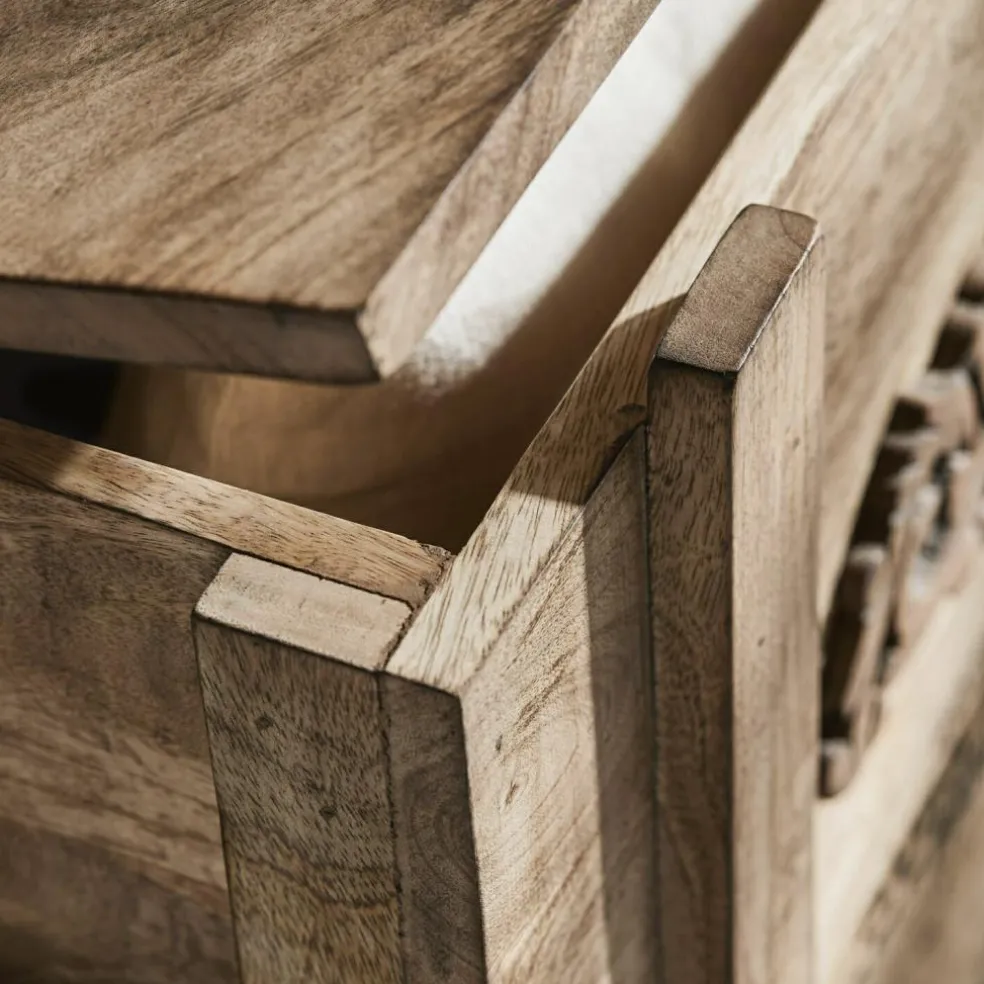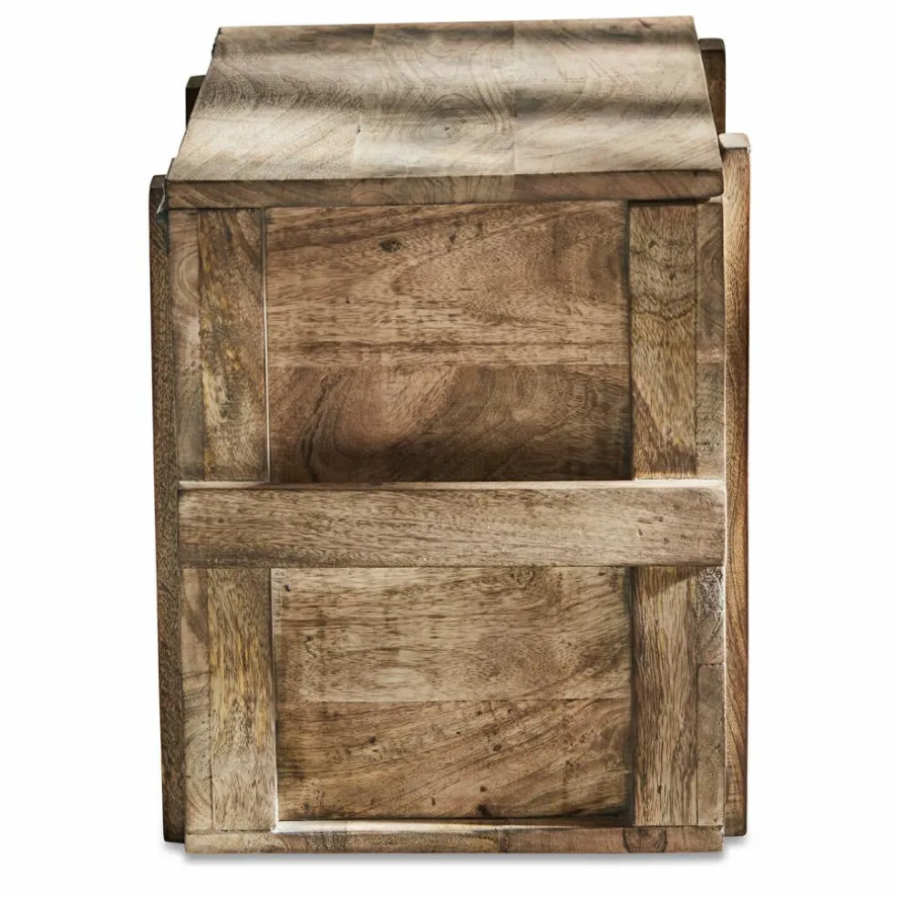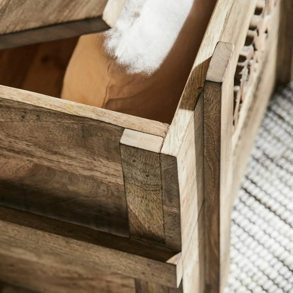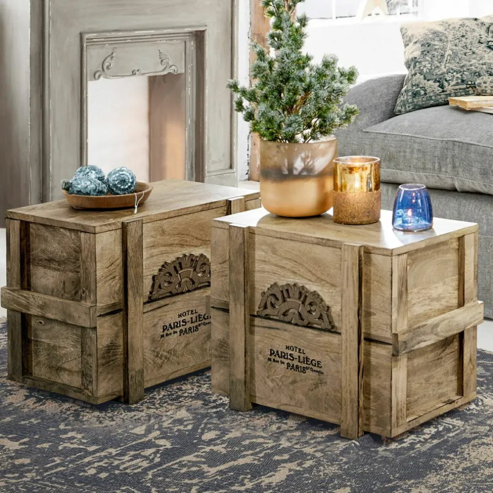 Was für eine verlockende Vorstellung: Man stöbert auf Großmutters Dachboden und entdeckt plötzlich diese Truhe! Schon die Tatsache, dass sie aus massivem Holz besteht, zeigt deutlich, dass sie nicht aus jüngster Zeit stammt und auch der nostalgische Schriftzug mit dem Emblem scheint weit in die Vergangenheit zurückzuführen. Dann öffnen Sie vorsichtig und mit etwas Herzklopfen den Deckel der Truhe … und entdecken darin vielleicht eine alte Porzellanpuppe und ein Bündel Briefe, die mit einem rosa Bändchen und mit einem vertrockneten Veilchenstrauß geschmückt sind. Ob das Großmutters Puppe war? Und die ersten Liebesbriefe, die sie als junges Mädchen von einem heimlichen Verehrer bekam? Auf jeden Fall ist es diese Truhe wert, bald als nostalgisches Schaustück in Ihrem Wohn-Interieur präsentiert zu werden. Im Eingangsbereich des Hauses, im Wohnraum oder auch im Schlafzimmer. Eben überall dort, wo Sie Stauraum mit antiker Ausstrahlung zu schätzen wissen. Und wann immer Sie den Deckel der Truhe öffnen, um etwas herauszuholen oder hineinzulegen, können Sie sicher sein, dass er nicht unkontrolliert herunterfallen wird, denn die Truhe ist mit einem Mechanismus ausgestattet, der das verhindert. Aus edlem Mangoholz gearbeitet, mit antiker Patina.