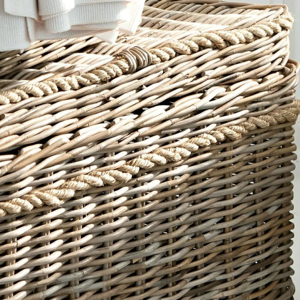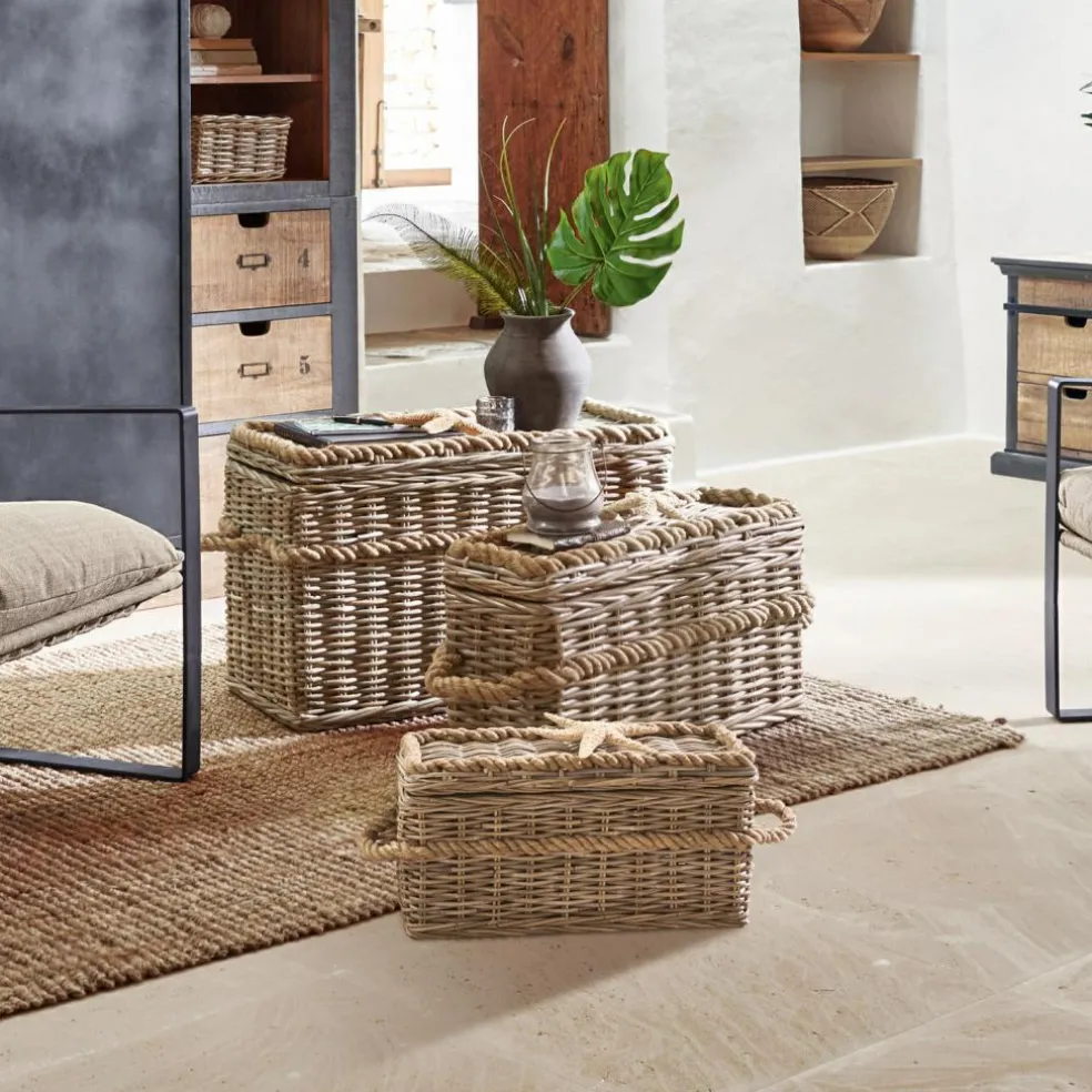 Stauraum mit Stil – und garantiert ein charmanter Hingucker in jedem Raum! Die drei Korbtruhen in unterschiedlicher Größe wurden in liebevoller Handarbeit aus hochwertigem Rattan geflochten. Jede von Ihnen hat einen klappbaren Deckel und ist an den Seiten mit Henkeln ausgestattet. Praktisch: Die Truhen passen exakt ineinander – nehmen also kaum Platz weg, wenn sie mal nicht gebraucht werden.