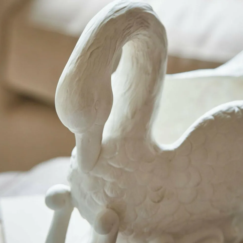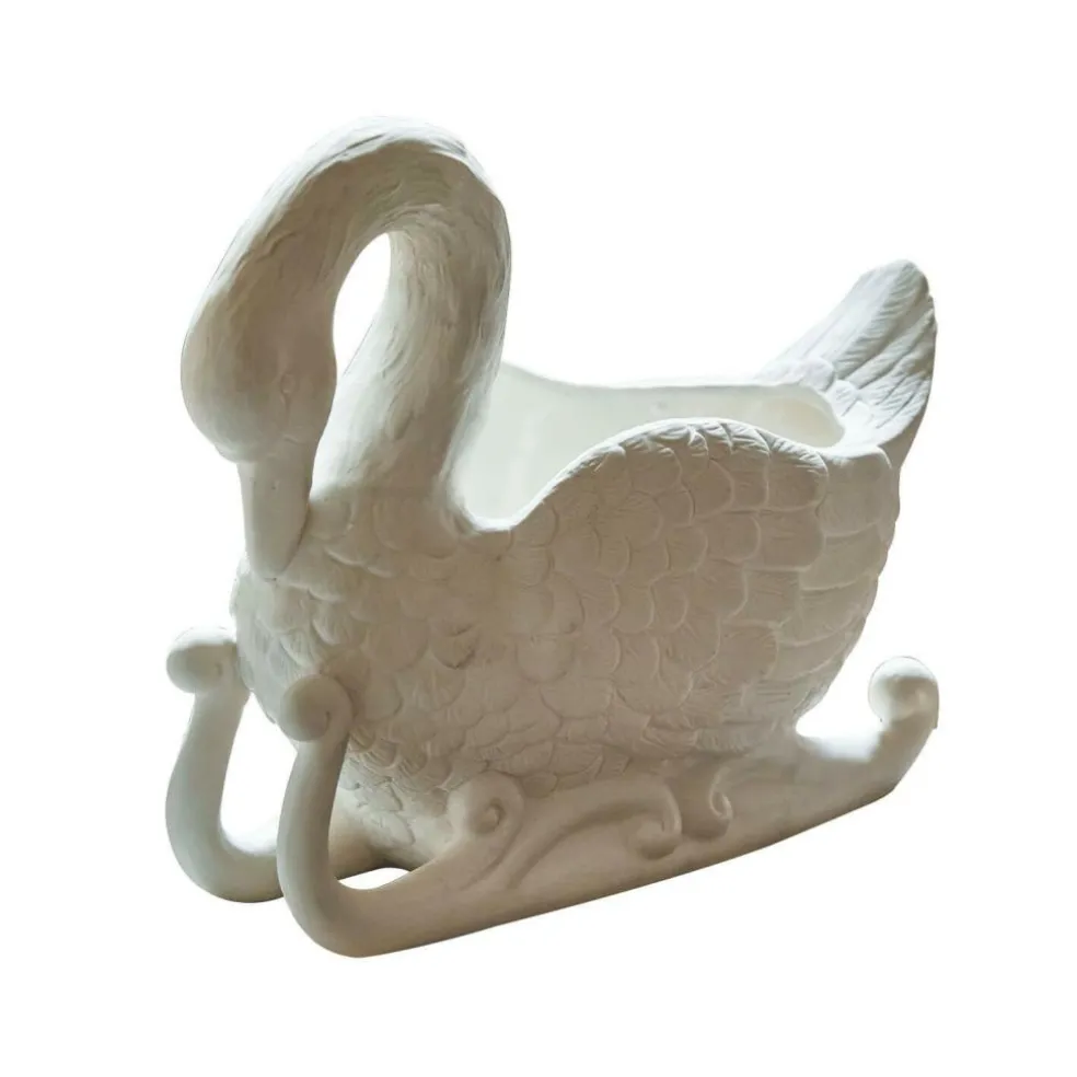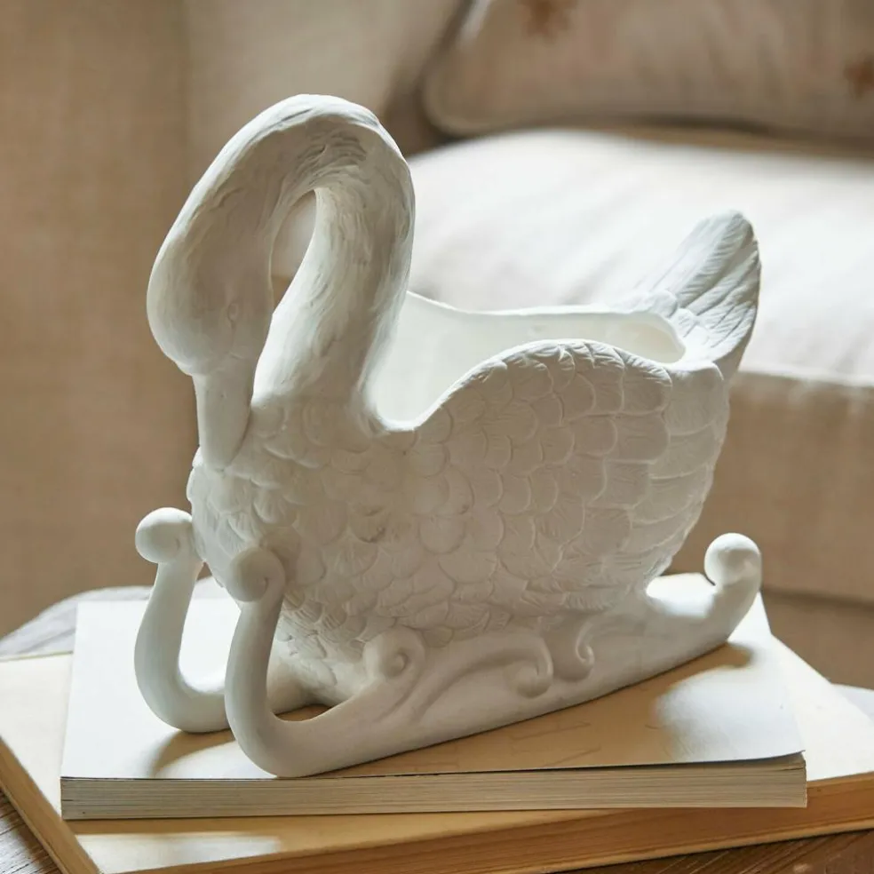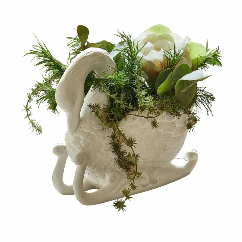 Mit anmutig gesenktem Kopf und kunstvoll ausgearbeiteten Flügeln gleicht dieser Übertopf einem poetischen Schwan auf einem Porzellanschlitten. Die cremeweiße Oberfläche unterstreicht die sanfte Anmutung und bringt die strukturierte Federzeichnung besonders schön zur Geltung. Ob als dekorativer Solist auf dem Sideboard oder gefüllt mit Moos, Hyazinthen oder Christrosen – der Schwan wird zum stillen Star jeder Winter- oder Frühlingsdekoration. Seine liebevoll gestaltete Form erinnert an klassische Porzellanfiguren und verleiht Ihrem Zuhause eine Note von verträumter Eleganz.