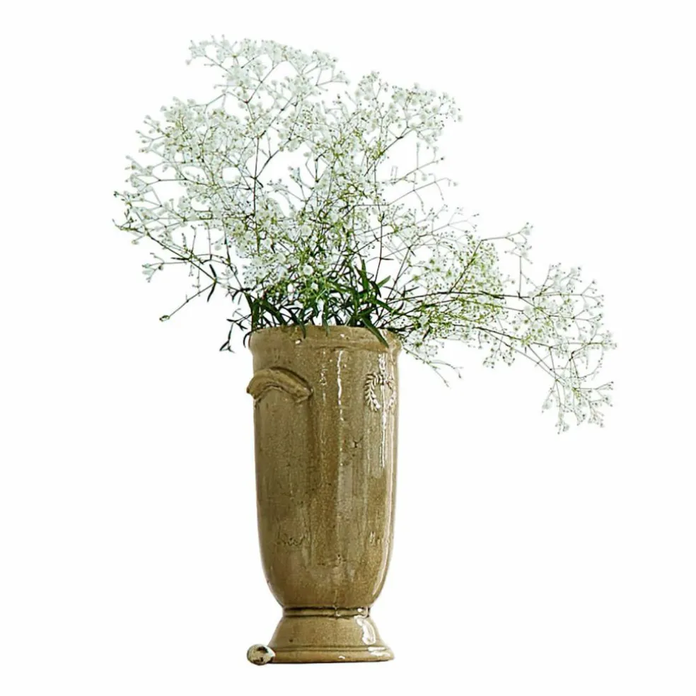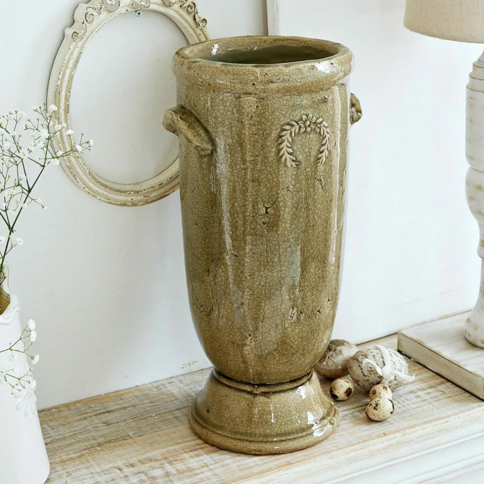 Der Übertopf aus handglasierter Terrakotta bringt einen Hauch von Nostalgie und Natur in Ihre Räume. Seine rau-glänzende Oberfläche mit feinen Rissen und unregelmäßigen Details zeugt von echter Handwerkskunst. Die dezente, leicht verwitterte Farbgebung verleiht ihm eine warme, erdige Ausstrahlung, während die zarten Verzierungen ihm ein historisches Flair geben. Ideal, um Pflanzen oder Dekorationen stilvoll zu präsentieren und jedem Raum eine einladende, persönliche Note zu verleihen.