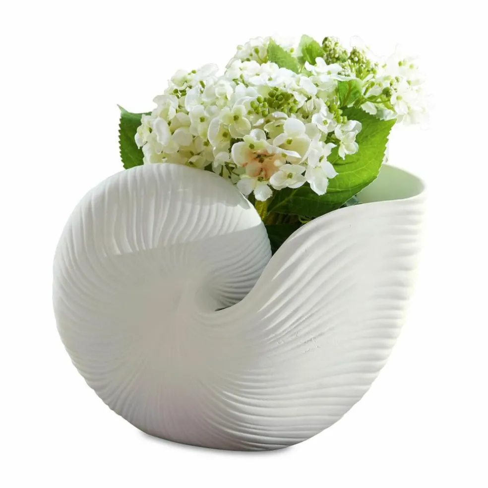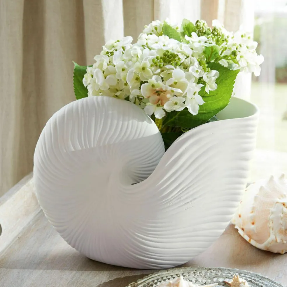 Die zeitlose Form eines filigranen Schneckenhauses ziert diesen edlen Übertopf aus Polyresin. Er ist sehr dekorativ und lässt sich vielseitig nutzen – mit Blumen oder Gräsern bepflanzt, solo als Zierde oder kreativ umfunktioniert. Sie könnten ihn etwa als Halter für Schminkpinsel oder Stifte nutzen und so Funktion und Dekoration perfekt vereinen. Das elegante Accessoire passt sehr gut zum Shabby-Chic. Es macht sich innen wie außen gut, vielleicht als stimmungsvolles Schmuckstück auf dem Balkon. In Innenräumen könnte der feine Übertopf das Badezimmer zieren, auf dem Nachttisch oder der Fensterbank platziert werden sowie im Wohnzimmer nostalgischen Charme verbreiten.