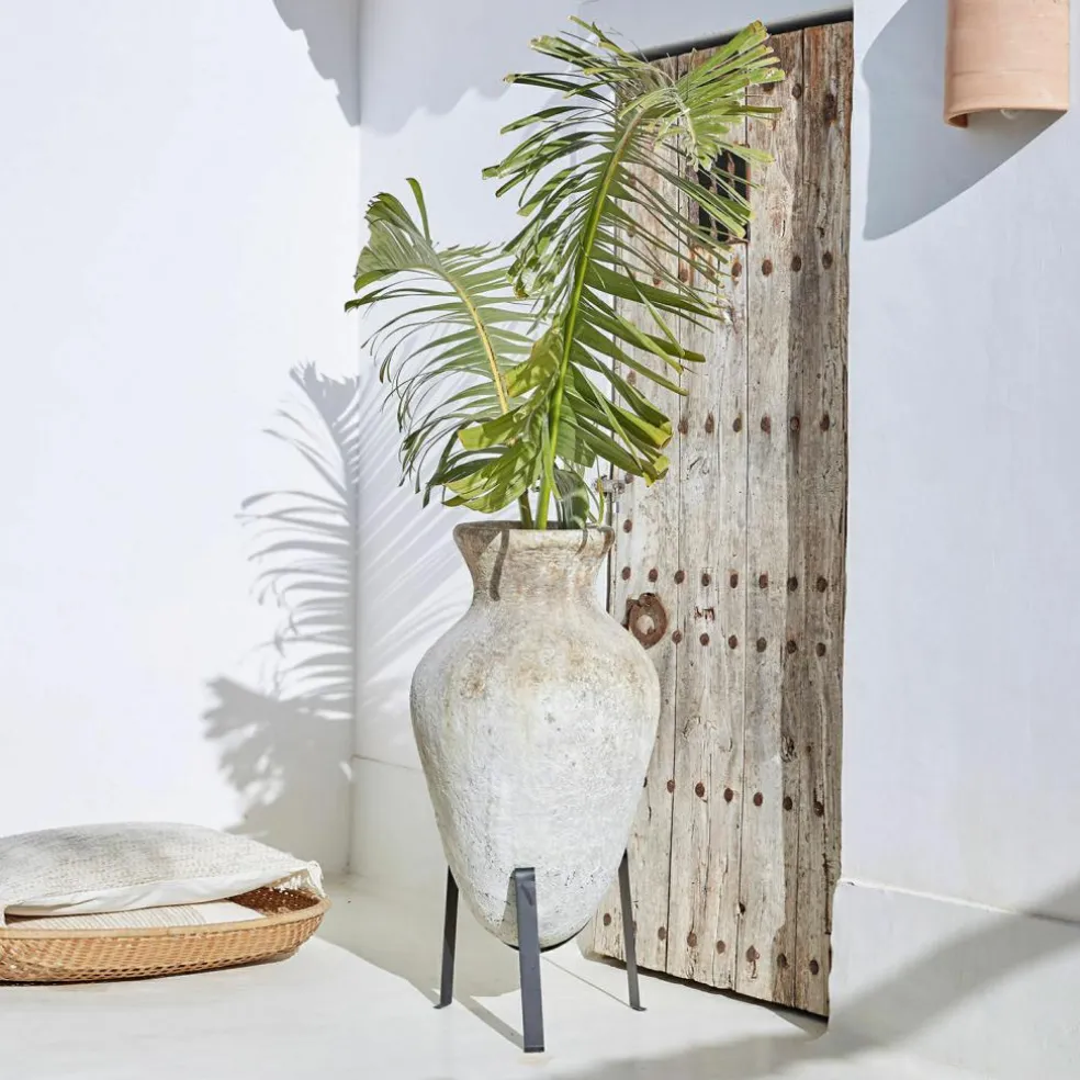 Möchten Sie Ihrem Zuhause ein zauberhaftes Ambiente schenken? Dieser Übertopf ist das edle Schmuckstück, das Ihre Träume von einem stilvollen und außergewöhnlichen Interieur wahr werden lässt. Der große Übertopf aus hochwertigem Material mit Antik-Finish vermittelt den Eindruck einer kostbaren Steinvase und wird sicherlich zum Eye-Catcher in jedem Raum. Das einzigartige Gestell aus Eisen verleiht ihm einen modernen, mediterranen Touch und macht ihn gleichzeitig robust und stabil. Ob im Garten, auf dem großen Balkon oder im Wohnzimmer, der Topf ist vielseitig einsetzbar und schafft überall ein schönes Ambiente. Nutzen Sie ihn für frische Blumensträuße oder dekorative Trockenblumen – er macht alles zu etwas ganz Besonderem.