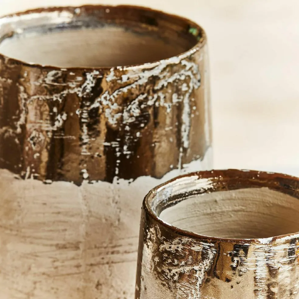 Mit diesem Vasen-Set holen Sie sich ein Stück handwerklicher Kunst in Ihr Zuhause. Die Vasen überzeugen durch ihre besondere Materialität: Terrakotta in natürlichem Matt-Finish, das sich perfekt mit der glänzenden, bronzefarbenen Oberkante ergänzt. Die feinen Farbnuancen und die bewusst unregelmäßige Oberfläche verleihen jedem Stück einen individuellen Charakter. Ob mit Blumensträußen oder als dekoratives Highlight – die harmonische Kombination aus rustikalem Charme und modernem Design macht diese Vasen zu einem Blickfang auf jedem Tisch oder Sideboard. Lassen Sie sich von der zeitlosen Schönheit inspirieren, die sie in Ihr Ambiente bringen.