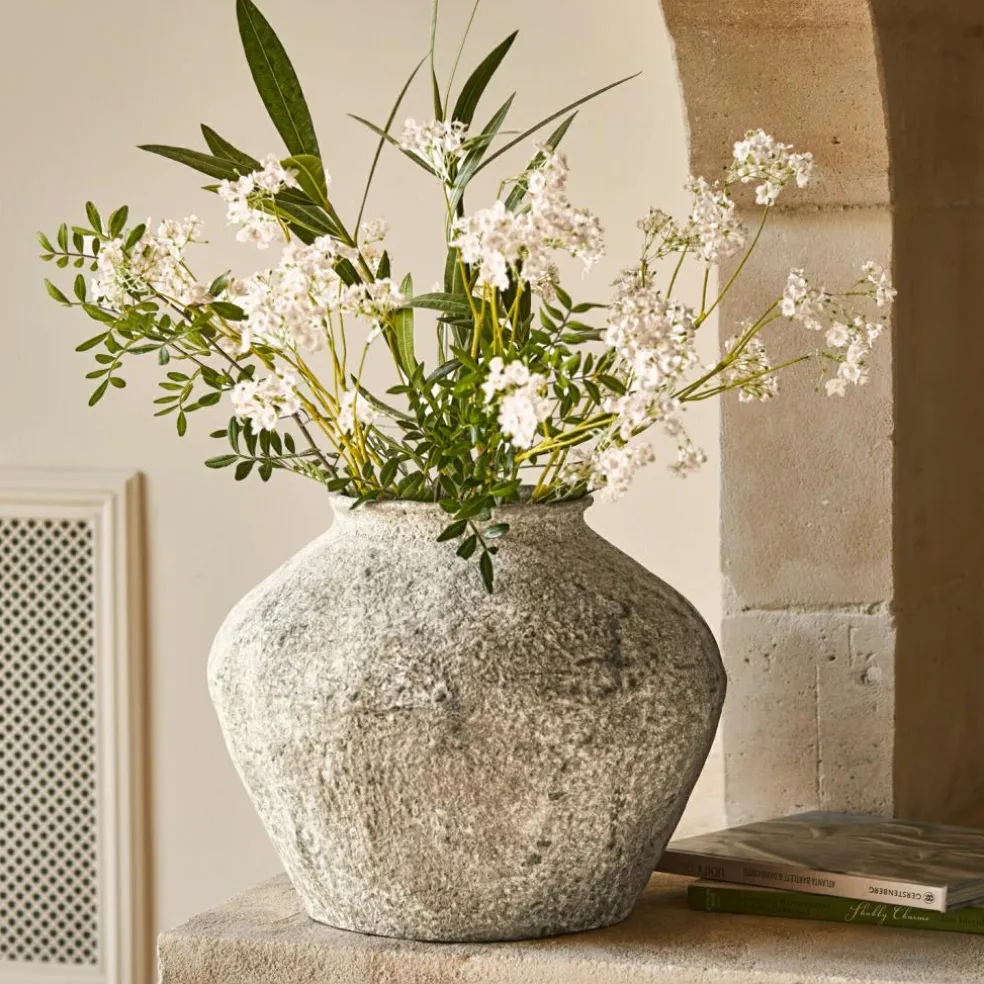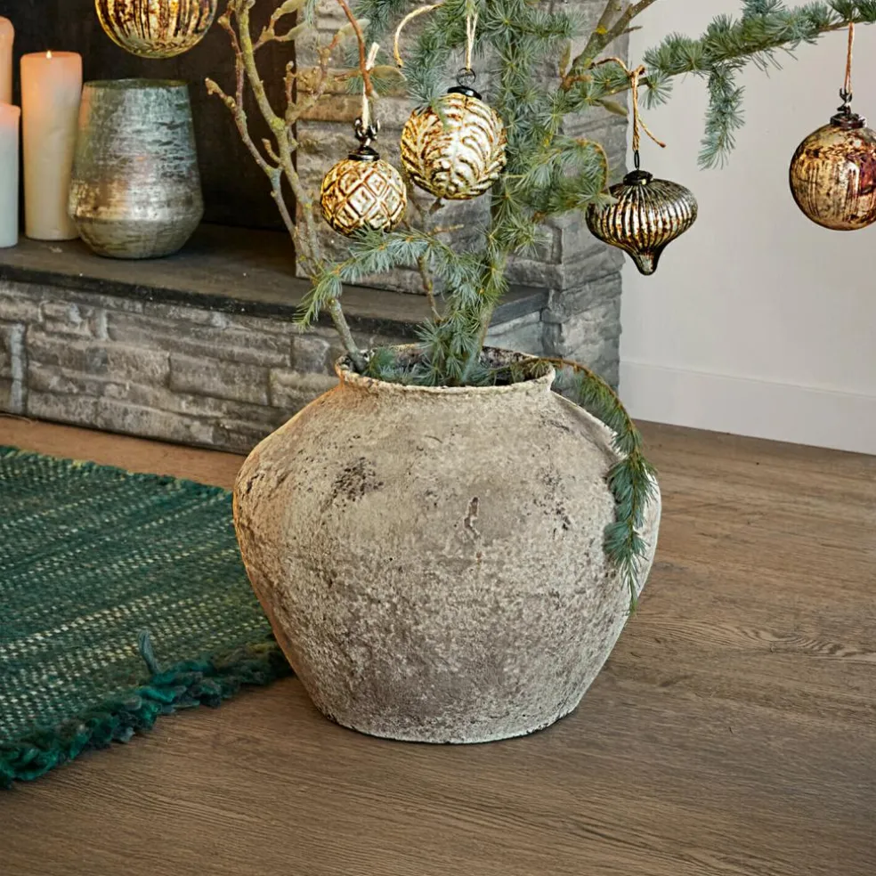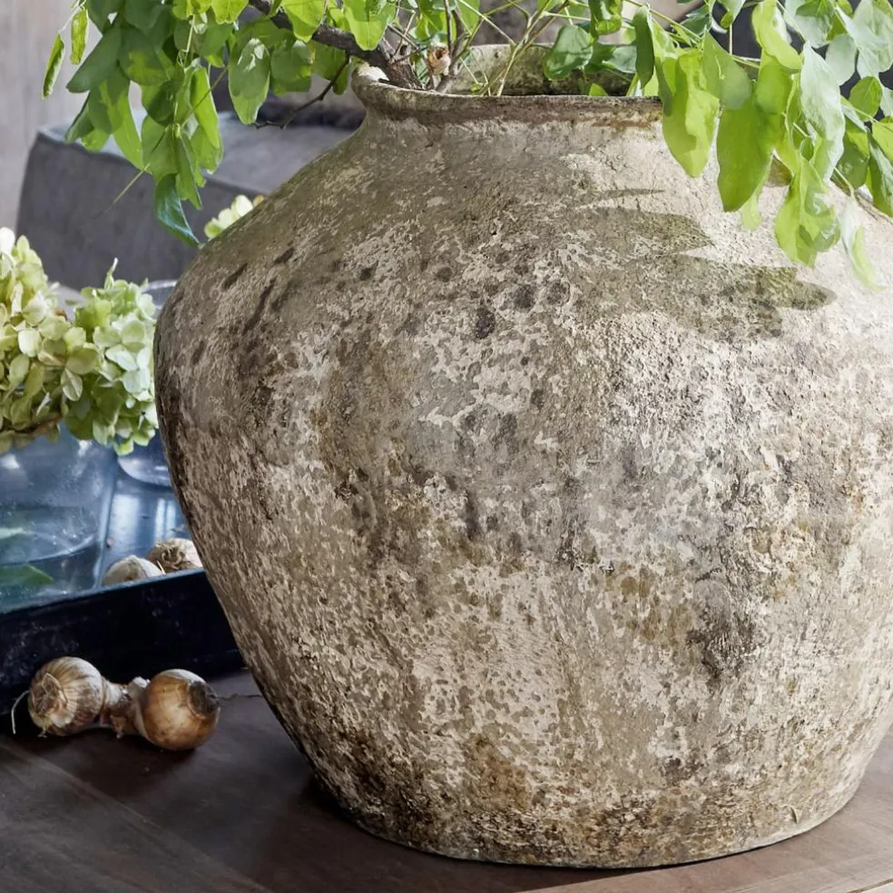 Dieses wunderschöne Stück wirkt absolut authentisch. Man könnte die Vase wirklich mit einer jahrhundertealten Antiquität verwechseln. Sie ist wertvollen Terrakotta-Gefäßen nachempfunden, die man heute nur noch in Museen findet. Beim Material handelt es sich um hochwertigen Kunststein, der besonders langlebig und widerstandsfähig ist. Die Oberfläche wird in traditioneller Handarbeit veredelt, um einen authentischen Antik-Look zu erzielen. Fein gearbeitete Details und eine besonders charmante Oberfläche machen jede Vase zu einem Unikat. Sie kann für sich allein stehen oder mit einem bunten Strauß, getrockneten Sträuchern oder Kunstblumen kombiniert werden, um ein natürlich abgerundetes Gesamtbild zu erzielen.