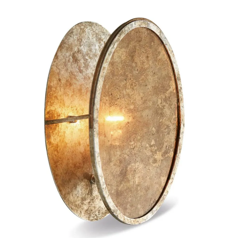 Die Wandlampe in moderner Konstruktion besitzt viel Patina und damit ihren ganz eigenen Charme. Sie bezaubert mit antik veredeltem Glas auf der Vorderseite und Eisen, welches ebenfalls ein Antik-Finish ziert, als Umrandung. Fällt der Lichtschein durch die gläserne Front, entstehen bezaubernde Lichtreflexe. Genießen Sie eine stilvolle und gemütliche Illumination. Die runde Form sorgt für besondere Harmonie. Hinten befindet sich eine Aufhängung. Für jeden Raum ein echtes Highlight, und ganz besonders zu einem Ambiente im Vintage-Look ein gekonntes Accessoire mit individueller Note. Die hochwertige Lampe fügt sich harmonisch ein und bringt den Charme vergangener Zeiten in Ihr Zuhause. Träumen Sie sich hiermit in eine frühere Ära und erleben Sie einen Hauch Romantik.