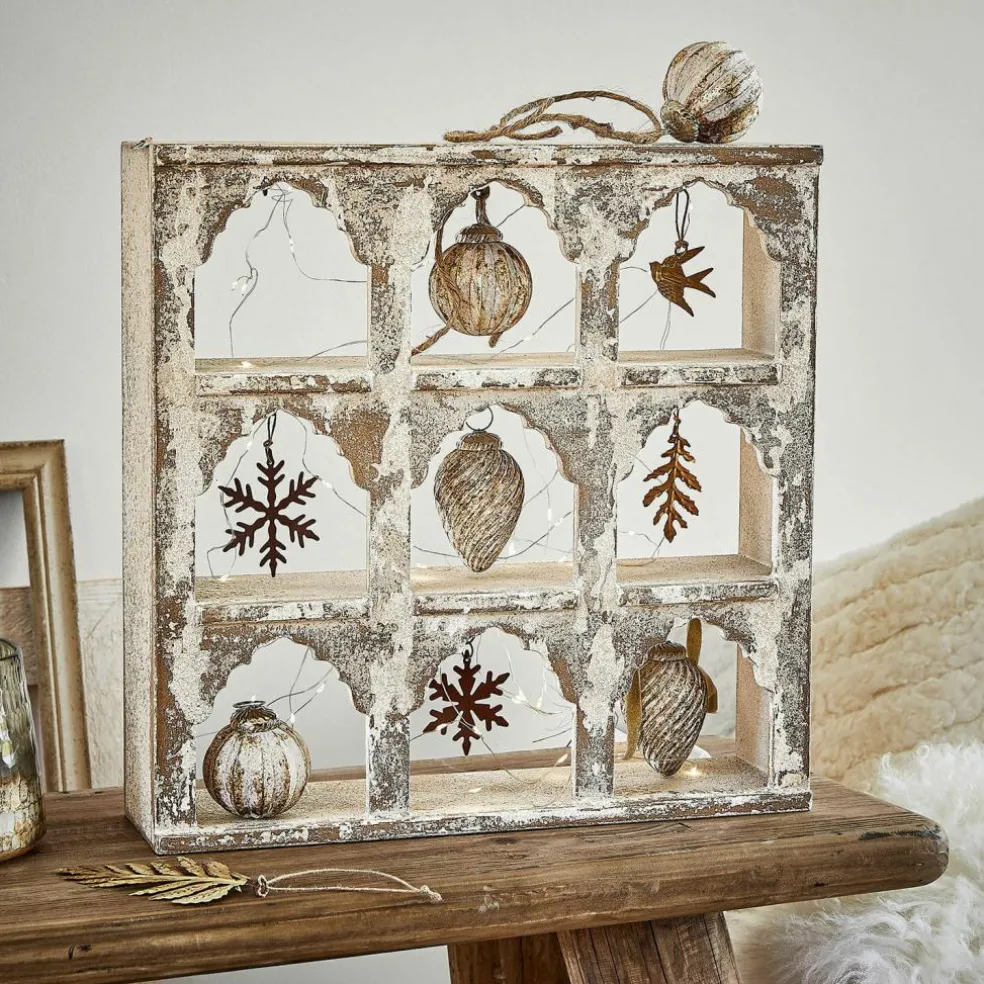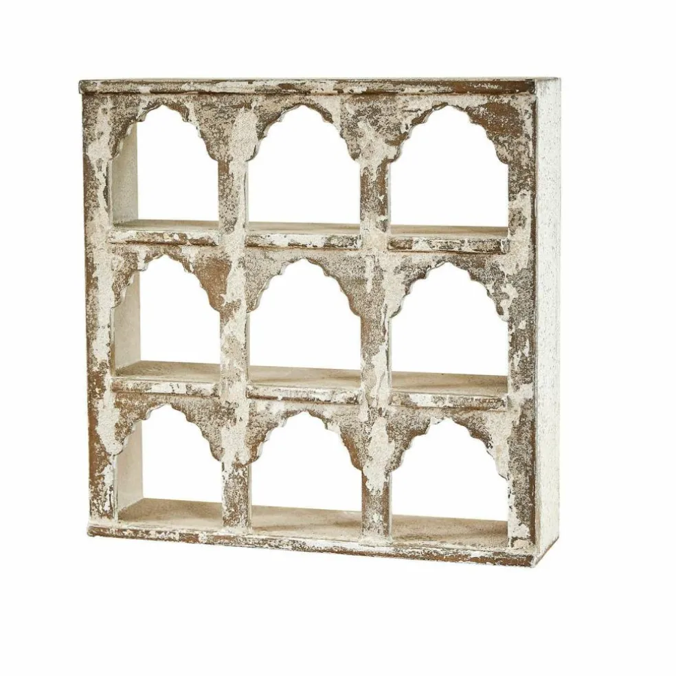 Dieser Wandorganizer vereint nostalgischen Charme mit praktischer Funktionalität. Das Holz mit Antikweiß-Finish verleiht dem Stück eine rustikale Eleganz, die jeden Raum aufwertet. Die sorgfältig gestalteten „Fenster“ mit den schönen Rundbogen-Öffnungen erinnern an historische Architekturen und bieten mit ihren integrierten Haken vielfältige Möglichkeiten, um Ihre Lieblingsstücke dekorativ zu präsentieren. Ob in der Diele für Schlüssel und Accessoires oder im Schlafzimmer für Schmuck – dieser Organizer schafft nicht nur Ordnung, sondern setzt auch stilvolle Akzente. Die sanft abgenutzte Oberfläche und die detaillierte Verarbeitung lassen ihn wie ein antikes Fundstück wirken, das Geschichten von vergangenen Zeiten erzählt.