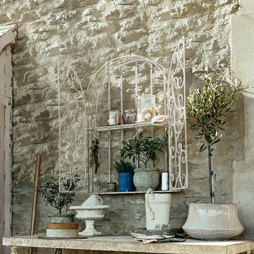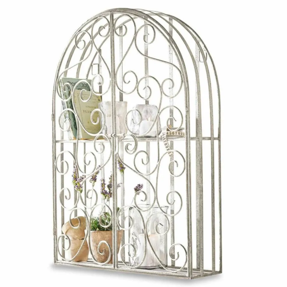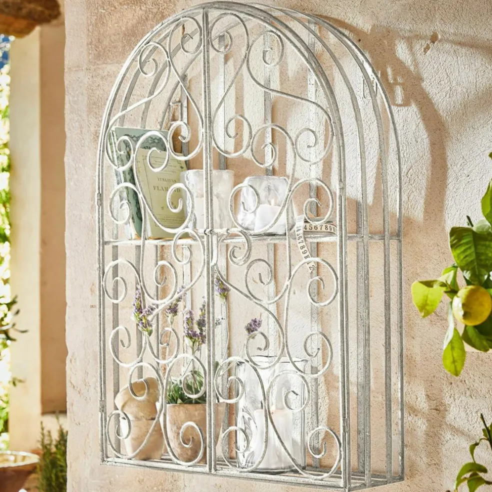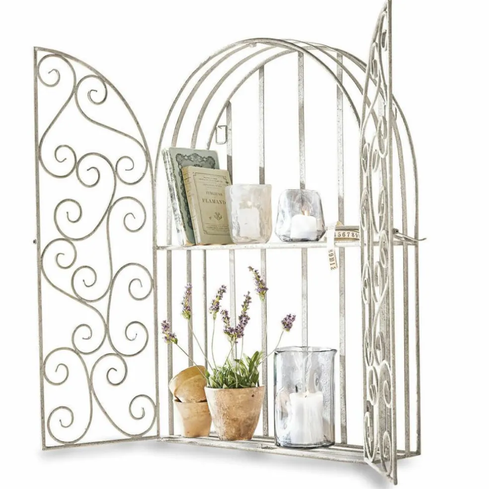 Möbel aus kunstvoll geschmiedetem Eisen gehören zum Repertoire bekennender Romantiker. Das Spannungsfeld zwischen der Schlichtheit des Materials und den stilvoll geschwungenen Formen steht für jene Originale französischer Vorbilder, die auch dieses Regal ausstrahlt. Gerade für draußen eignet sich der robuste Werkstoff ideal, denn Sonne, Kälte oder Nässe können ihm nichts anhaben. Und mit der Zeit gewinnt auch die antike Patina immer mehr an Schönheit. Die Fertigung des Regals stellt höchste Ansprüche an die Schmiedekunst. Dabei erinnert seine Formgebung an einen romantischen Rosenbogen, dessen zwei Regalböden darin elegant zu schweben scheinen. Vollendet wird der Auftritt durch zwei Türen mit kunstvoll gefertigten Ornamenten, die sich dank Schieberegler leicht öffnen und schließen lassen. Zwei Haken auf der Rückseite ermöglichen ein unkompliziertes Befestigen an jede Wand. Ob auf Ihrer Terrasse, Loggia oder auch in Ihrem Eingangsbereich – der antike Charme dieses Regals ist bestechend und wird schnell zum ästhetisch wertvollen Blickfang. Was gibt es nun Schöneres, als dem Eisenmöbelstück mit verschiedenen Accessoires das i-Tüpfelchen aufzusetzen. Windlichter, Grünpflanzen oder Vasen sind nur einige Möglichkeiten – Ihren Ideen sind keine Grenzen gesetzt.