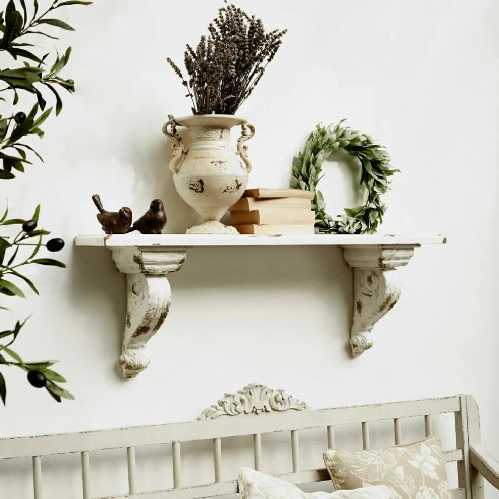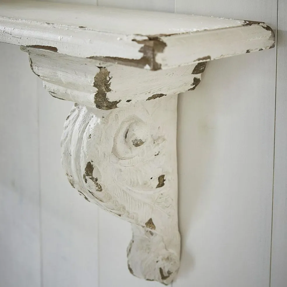 Bei dieser charmanten Wandkonsole ist es Liebe auf den ersten Blick, vor allem, wenn Sie Fan hochwertiger Shabby Chic-Accessoires sind. Sie wirkt wie ein wertvolles Museumsrelikt aus längst vergangenen Tagen und präsentiert wunderschön gearbeitete Details. Das beginnt schon bei den charmanten Finessen der aus Kunststein geformten Halterungen. Sie bilden eine tolle Bühne für das darauf liegende Holzbrett. Die Halterungen sind mit demselben Antik-Finish behandelt wie die großzügig dimensionierte Ablage. Das Finish wird in mehreren Schichten aufgetragen und sorgfältig bearbeitet, um für authentische Alterserscheinungen zu sorgen. Das edle Vintage-Design fügt sich nahtlos in klassisch eingerichtete Wohnkonzepte ein und bildet einen hervorragenden Kontrast zu zeitgenössischen Interieurs.