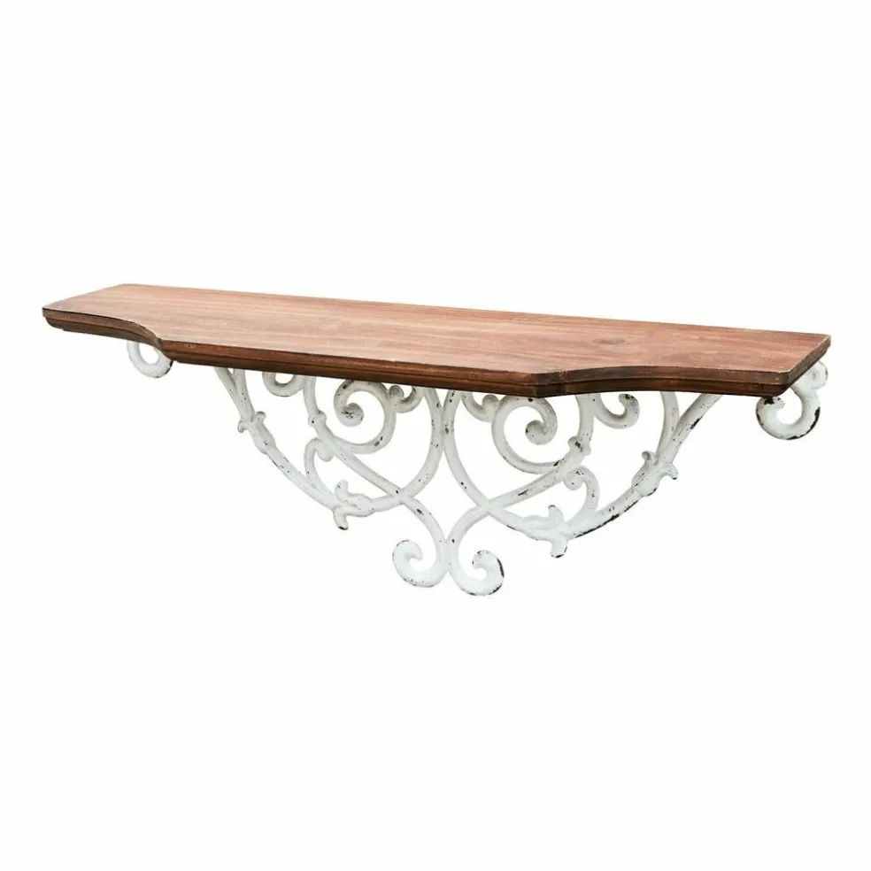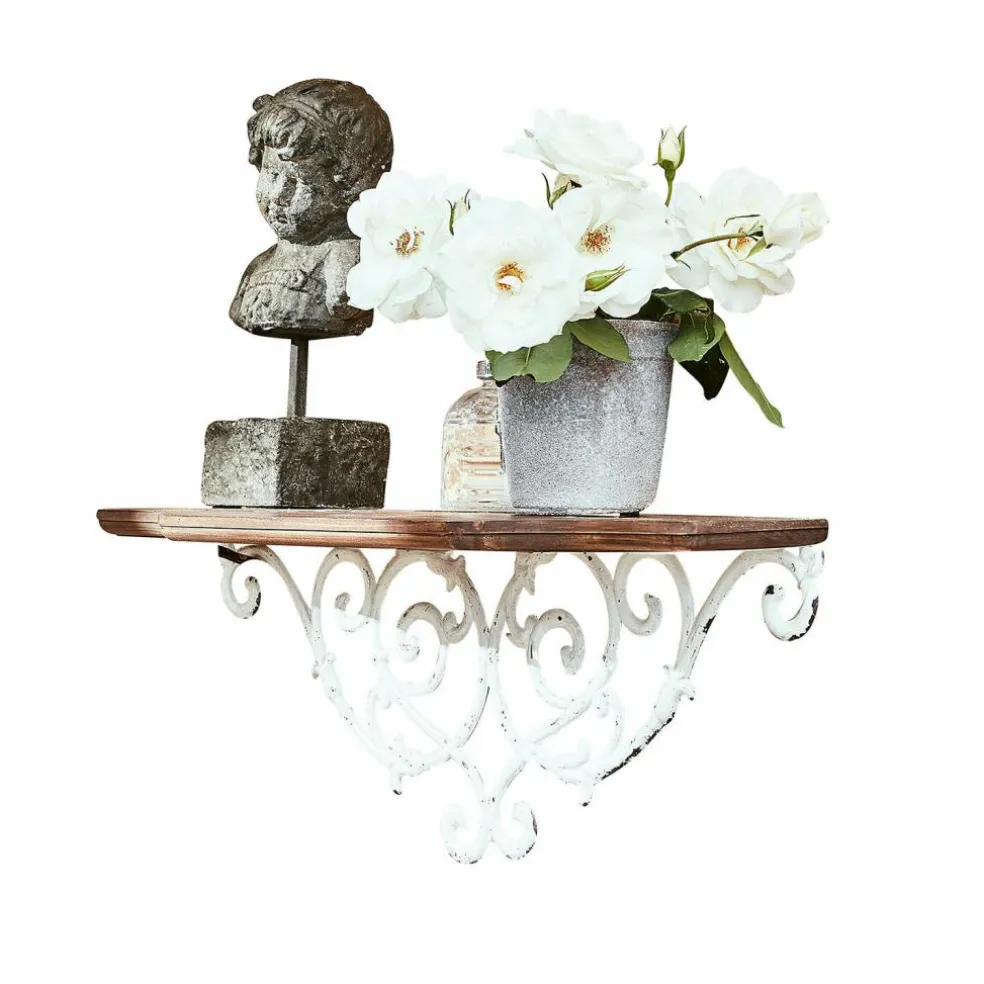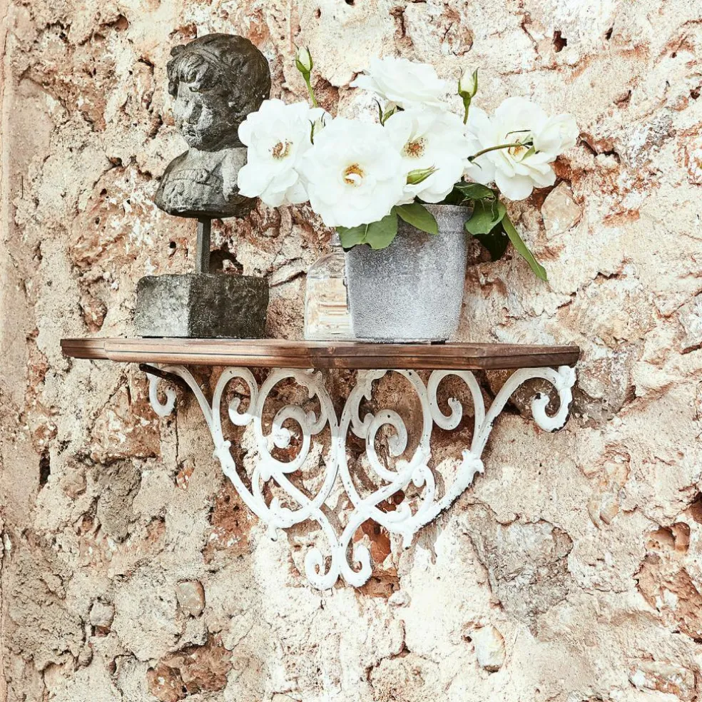 Romantikerinnen werden sich schon auf den ersten Blick in dieses Wandregal verlieben. Denn von den schwungvollen, ornamentalen Verzierungen aus Eisen über die reizvollen Shabby-Spuren bis zu der ebenfalls aufwendig gearbeiteten Kiefernplatte ist alles dabei, um nostalgische Gefühle zu wecken und die Gedanken in vergangene Zeiten wandern zu lassen. Eine Reise, die von vielen als angenehme Auszeit von der hektischen Gegenwart empfunden wird. Daneben kann das Wandregal aber durchaus auch praktische Aufgaben übernehmen. Auf dem Bord können kleine Vasen, Dosen, Blumen, Kerzen und vieles mehr dekoriert werden. Hier bekommen verschiedene Dinge einen neuen Stammplatz, je nachdem, wo das Wandregal bei Ihnen hängen wird. Ob im Haus oder auf dem überdachten Teil der Terrasse – das charmante Accessoire verbreitet die entspannte Stimmung französischer Landhäuser.
