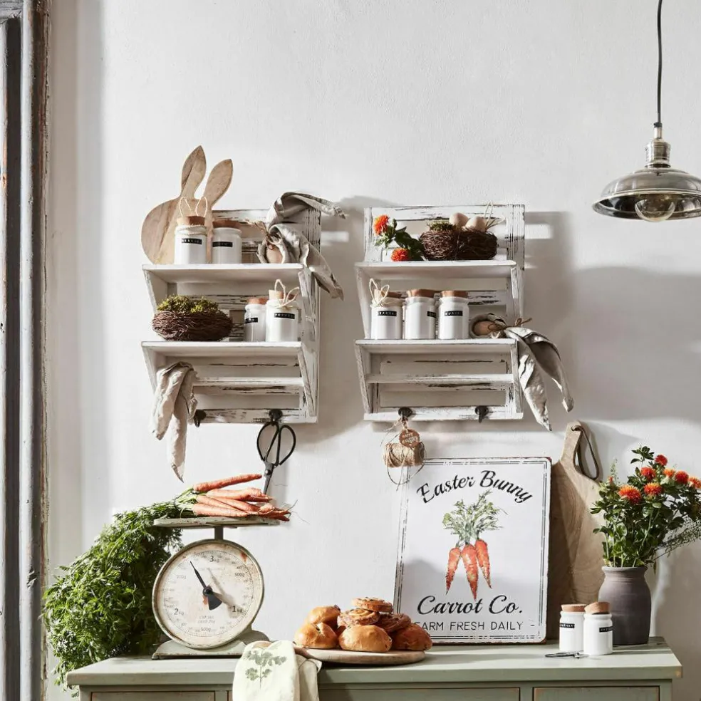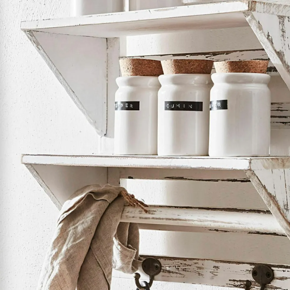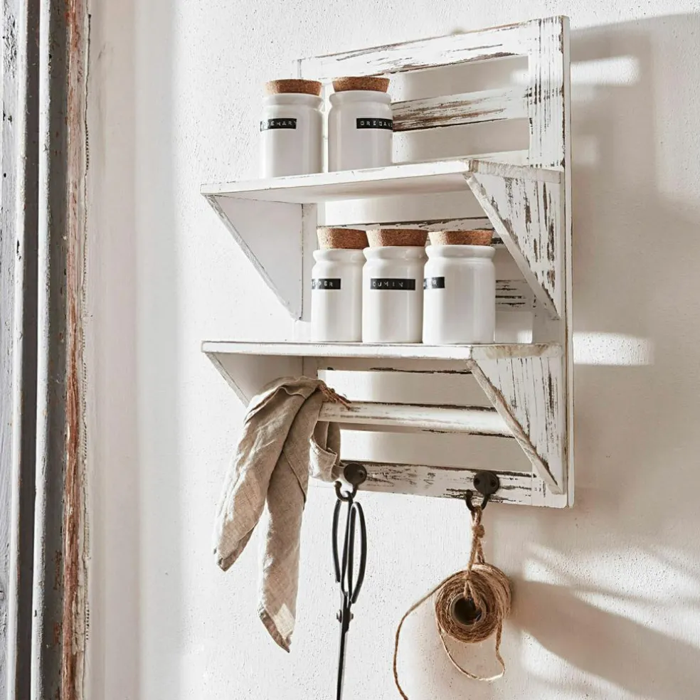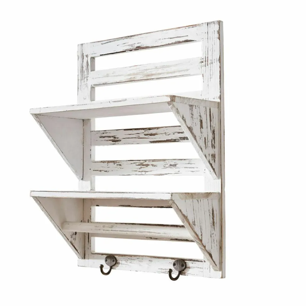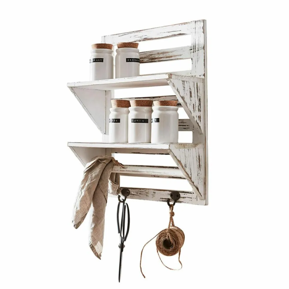 Dieses sehr schöne und nützliche Wandregal besteht aus Tannenholz mit Antik-Finish. Es hat handliche Maße und schafft auch in kleinen Zimmern Stauraum, ohne Platz wegzunehmen. So eignet es sich wunderbar für Küche, Bad oder auch Wohnräume – Gewürze und Tassen, Kosmetika, Pflanzen oder Dekoratives wie Windlichter lassen sich hübsch darauf drapieren. An den beiden unteren Haken aus Eisen finden Handtücher, Kräuterbüschel oder Massagebürsten an einem kleinen Seil Platz. Dazu schmückt das rustikale Design vor allem ein Ambiente im Shabby-Chic und ist eine ebenso funktionale wie auch zierende Lösung für diverse Fragen der Aufbewahrung.