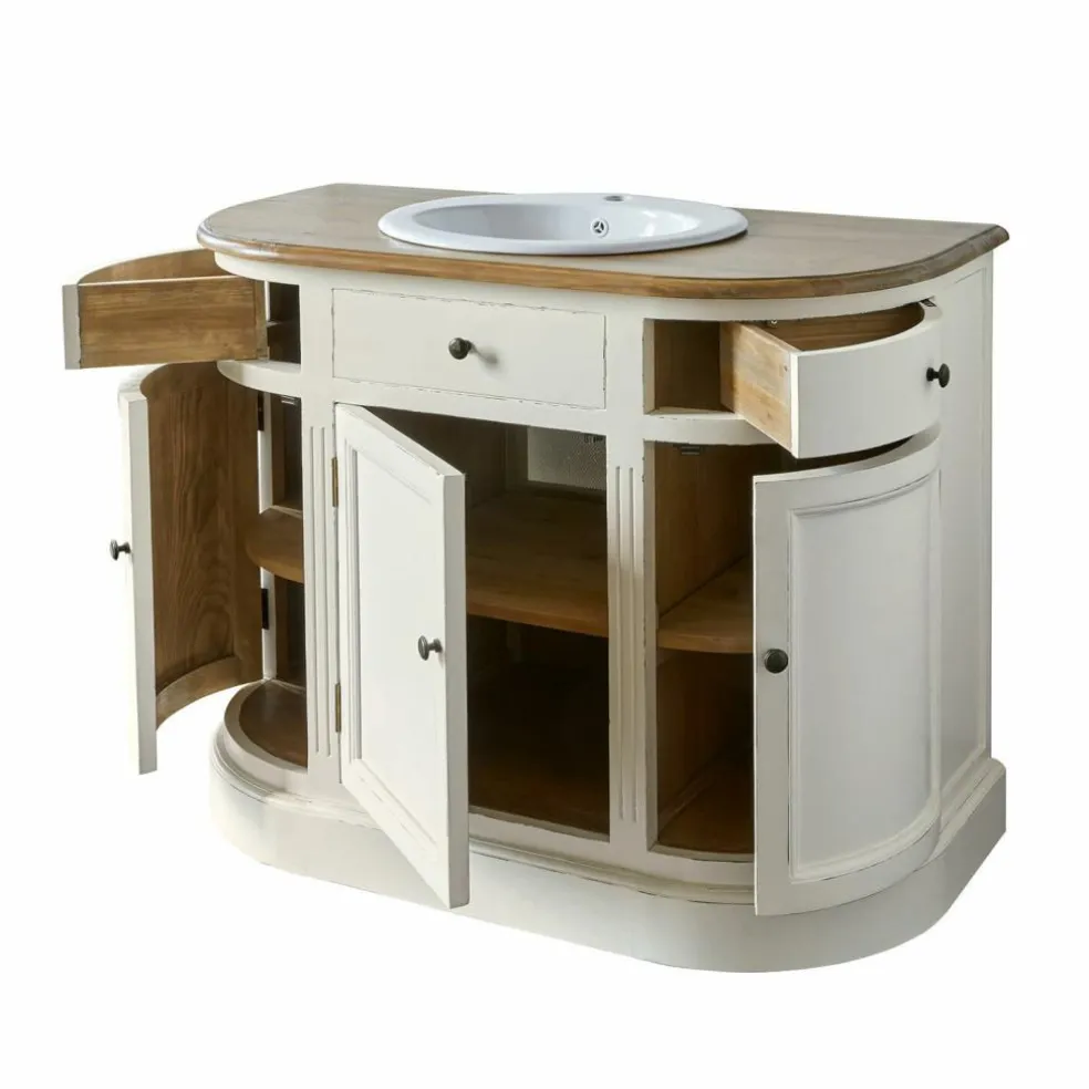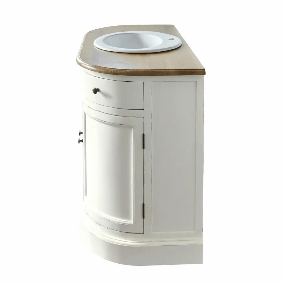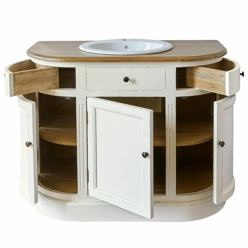Dieser stilvolle Waschtisch fängt das Beste aus beiden Welten ein – das rustikale Flair wiederaufbereiteten Tannenholzes und die reine Eleganz der Keramik. Das außen antikweiß gefinishte Gestell strahlt mit seinem Vintage-Charme, während die naturbelassene Innenausstattung und die robuste Ablage das Erbe des Holzes ehren. Hinter den Türen verbirgt sich viel Stauraum, wie auch hinter den zwei seitlichen Schubladen. Dieses Stück ist nicht nur ein Waschtisch, sondern eine funktionale Schönheit, die in jedem Badezimmer eine zeitlose Ästhetik verspricht.