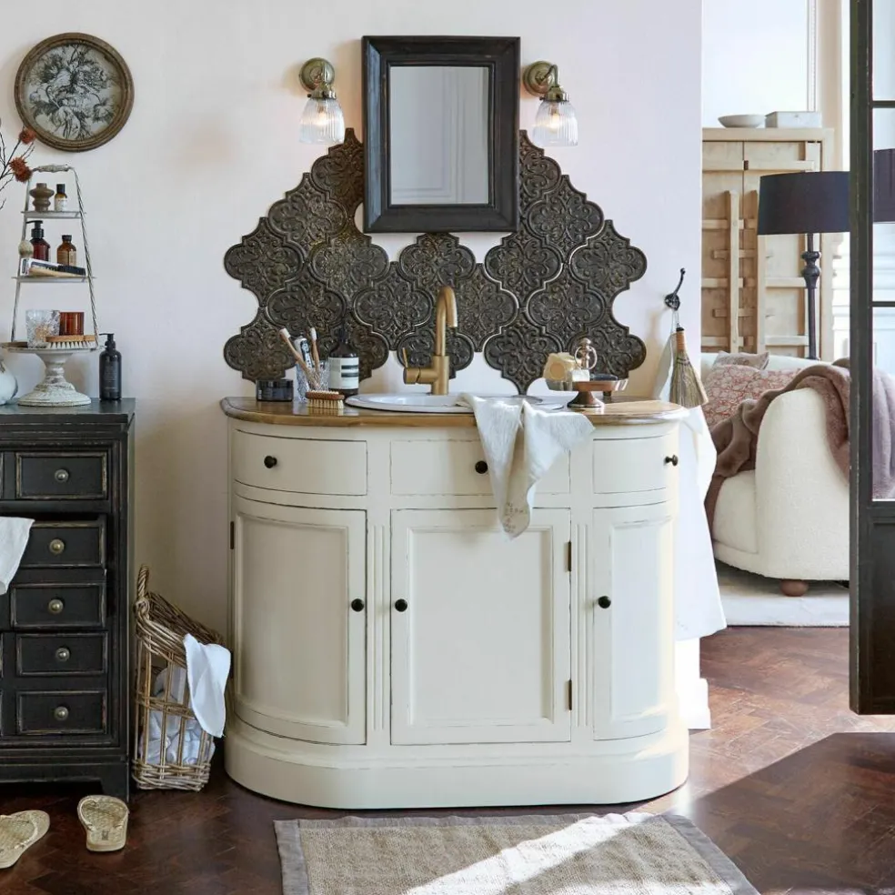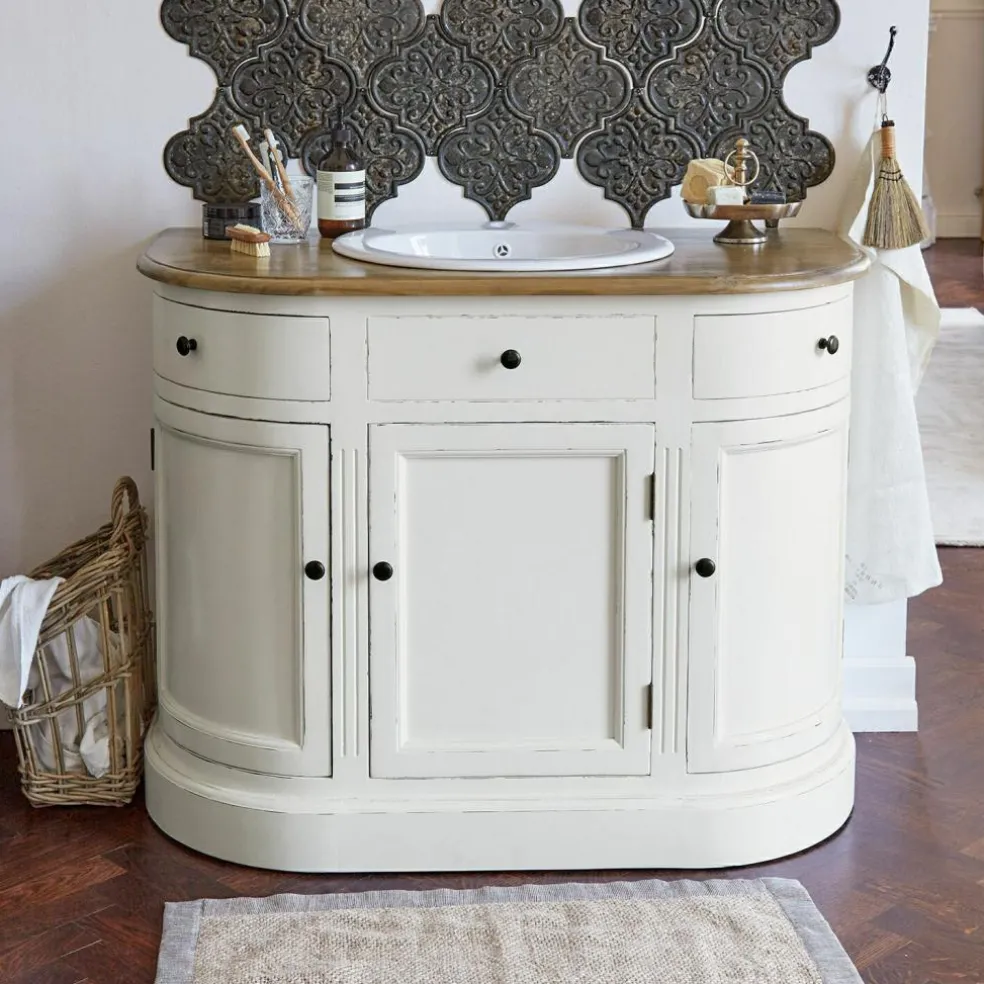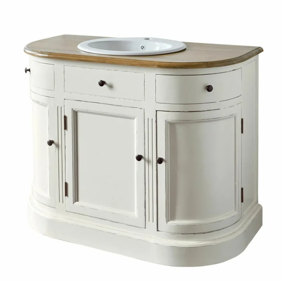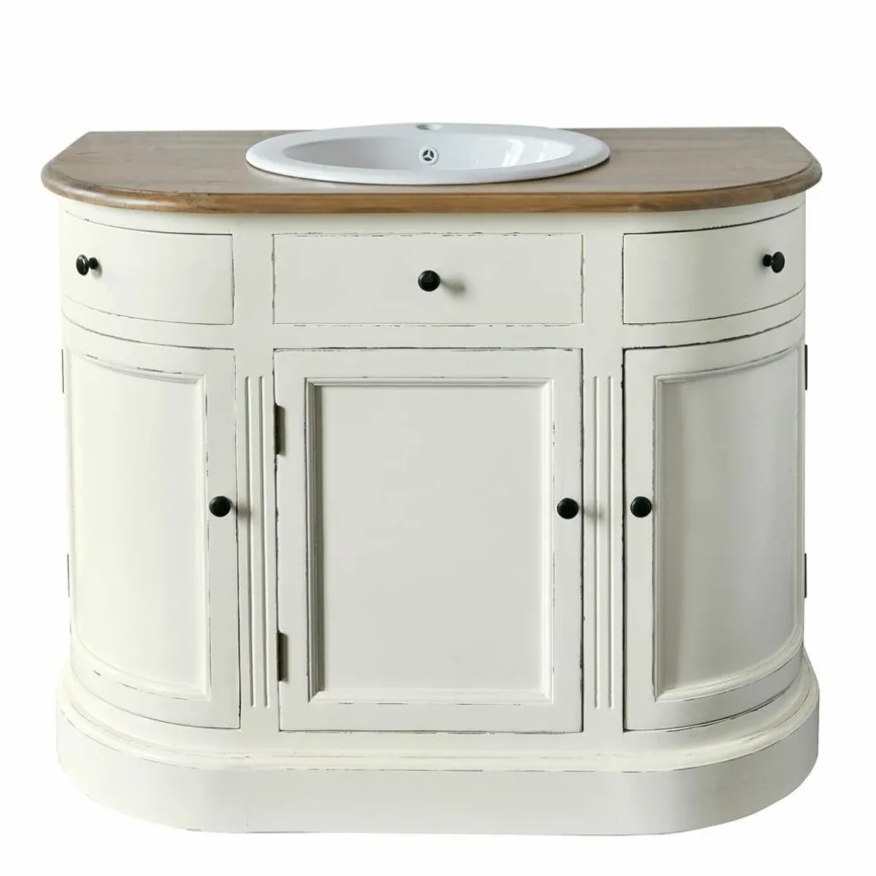 Dieser stilvolle Waschtisch fängt das Beste aus beiden Welten ein – das rustikale Flair wiederaufbereiteten Tannenholzes und die reine Eleganz der Keramik. Das außen antikweiß gefinishte Gestell strahlt mit seinem Vintage-Charme, während die naturbelassene Innenausstattung und die robuste Ablage das Erbe des Holzes ehren. Hinter den Türen verbirgt sich viel Stauraum, wie auch hinter den zwei seitlichen Schubladen. Dieses Stück ist nicht nur ein Waschtisch, sondern eine funktionale Schönheit, die in jedem Badezimmer eine zeitlose Ästhetik verspricht.