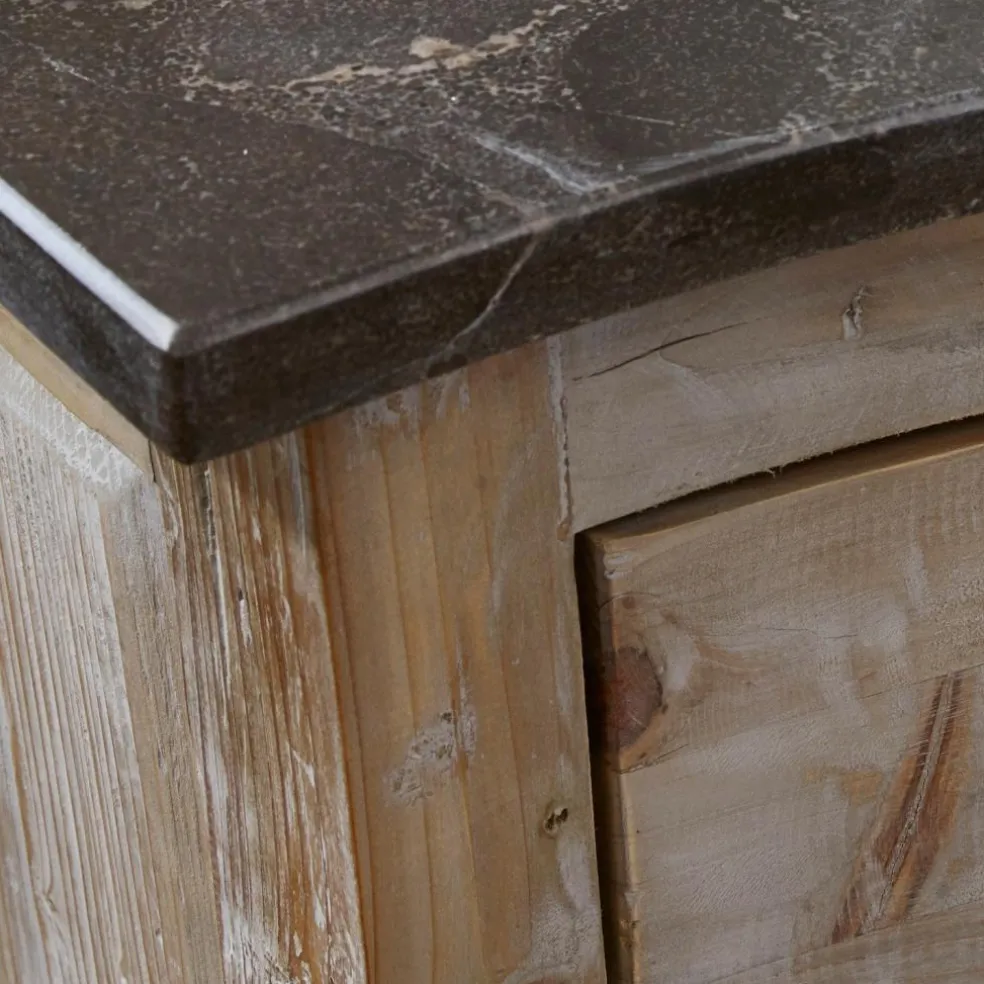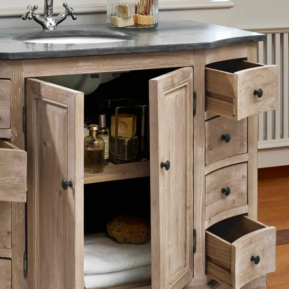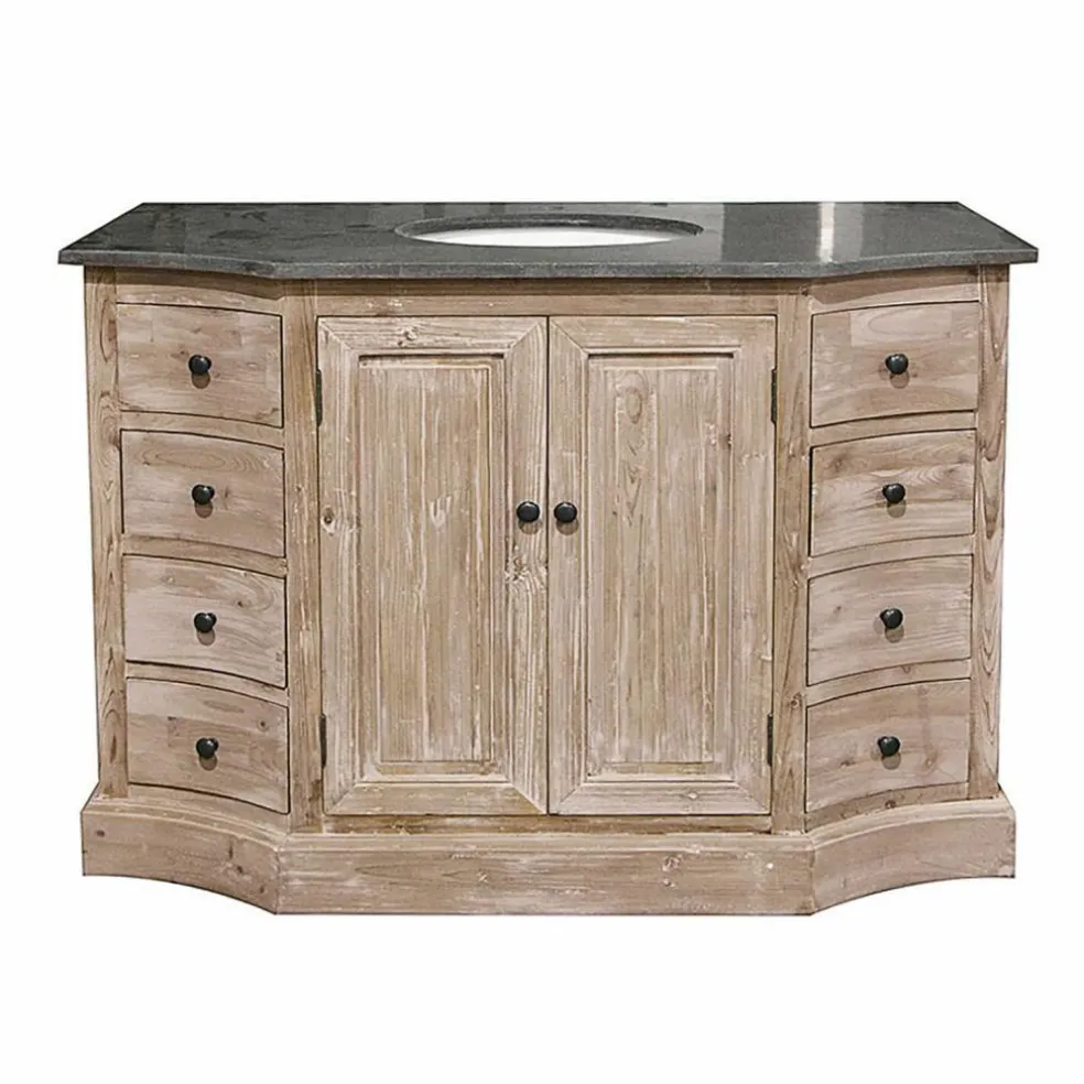 Hochwertige und vor allem natürliche Materialien wurden für diesen prächtigen Waschtisch kombiniert. Die dunkle Natursteinplatte, bildet einen tollen Kontrast zum Waschbecken und harmoniert wunderbar mit dem reizenden Tannenholzschrank in handgearbeiteter Qualität. Charmante Details wie gewölbte Schubladenfronten, raffinierte Zierelemente und eine hochwertige Antik-Lasur unterstreichen den edlen Look. Neben acht Schubladen, bieten zwei Fächer, ausreichend Platz für ihre Siebensachen. Natürlich unauffällig verborgen hinter zwei Türen in dezenter Kassettenoptik. Nicht im Lieferumfang enthalten sind die hier abgebildeten Armaturen und Syphon.