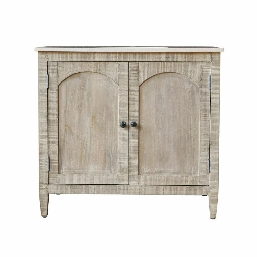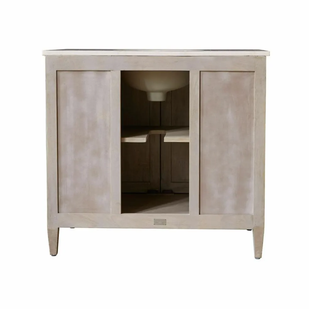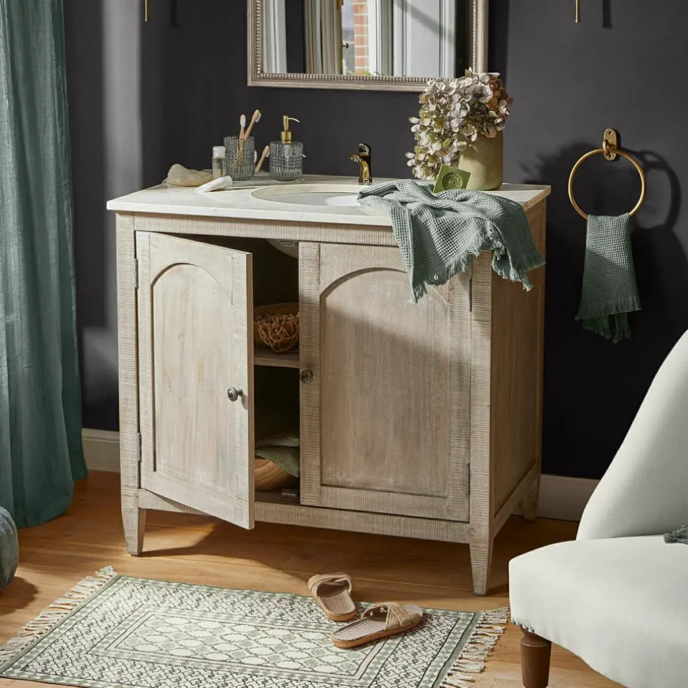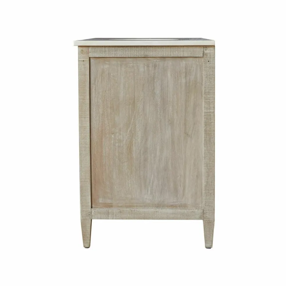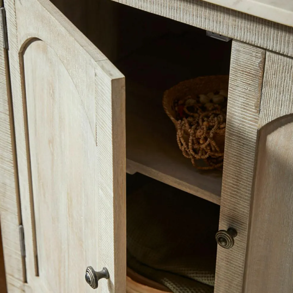 Wer das Besondere liebt, wird bei diesem Waschtisch fündig: Die Kombination aus echtem Holz mit gekalkter Oberfläche und einer fein strukturierten Rillenoptik schafft ein authentisches Wohngefühl – wie aus einem charmanten Landhaus. Die hochwertige Marmorplatte besticht durch ihre natürlich geäderte Zeichnung und verleiht dem Möbelstück eine zeitlose Note. Das sanft eingelassene Keramikbecken glänzt mit klaren Linien und Funktionalität. Besonders detailverliebt zeigt sich die Gestaltung der Front mit geschwungenen Paneelen und runden Metallknäufen. Ein Stück Badmöbel, das mehr als nur funktional ist – es erzählt von Stil, Wertigkeit und einer Vorliebe für das Echte.