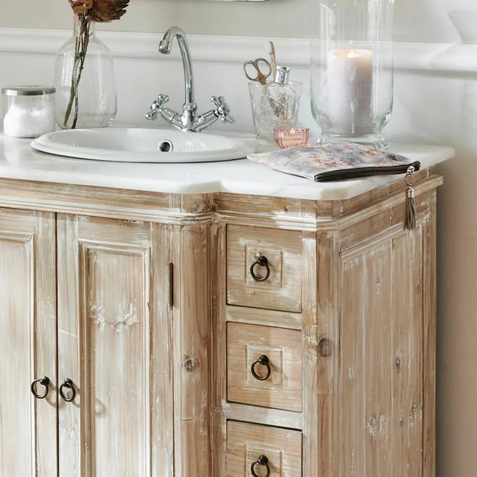 Das prachtvolle Bad-Möbel aus massivem Tannenholz besticht mit einer zeitlosen Kassettenoptik und einem zeitlosen, dezenten White-Washed-Finish. In die Mamorplatte ist ein ovales Keramikwaschbecken eingelassen. Und das Beste: Der Waschtisch punktet auch mit inneren Werten. Hinter den zwei Mitteltüren und in den insgesamt acht Schubladen verbirgt sich jede Menge Platz für allerlei Kleinkram, Handtücher, Kosmetika und andere Badutensilien.
