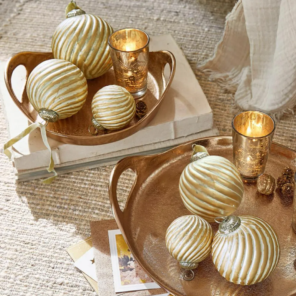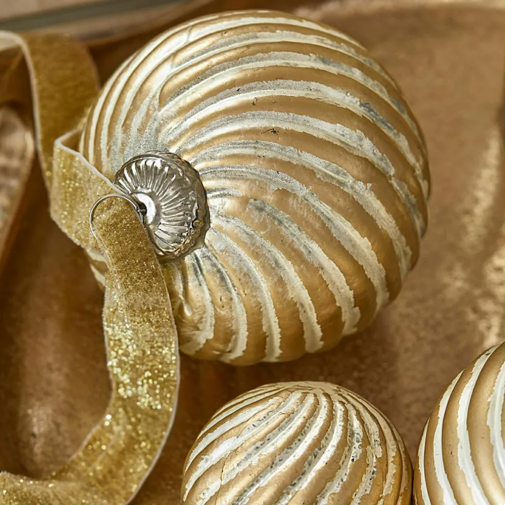 Mit diesem Set aus sechs Weihnachtskugeln holen Sie sich die Magie vergangener Zeiten direkt an Ihren Baum. Die Kugeln sind aus Glas gefertigt und bezaubern mit einem fein ausgearbeiteten Rillenrelief, das sanft das Licht reflektiert. Ihr antikgoldener Farbton wirkt wie leicht patiniert und verleiht ihnen eine besonders warme Ausstrahlung – als wären sie über Generationen hinweg bewahrt worden. In drei Größen gestaltet, bringen sie eine natürliche Dynamik ins Dekor und fügen sich dennoch harmonisch ins Gesamtbild ein. Ob als Ensemble am Baum oder dekorativ auf einem Tablett arrangiert: Diese Kugeln sind kleine Schmuckstücke voller Charme und nostalgischem Glanz.