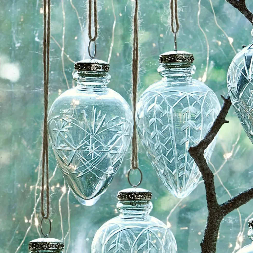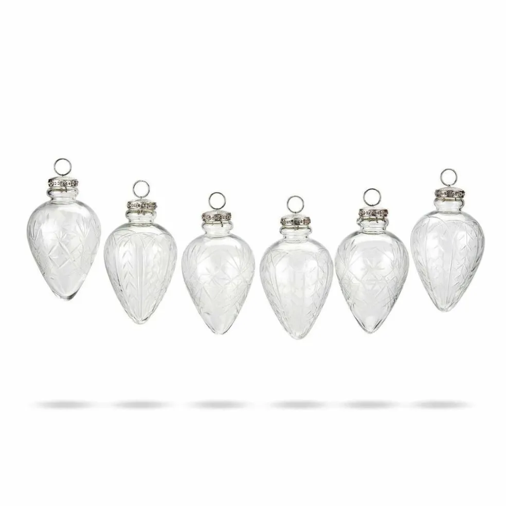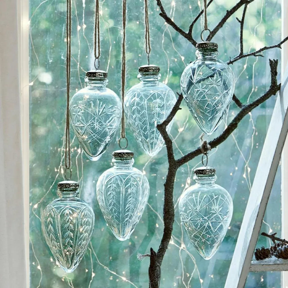 Sechs zarte Kunstwerke aus klarem Glas, das feine Sternen- und Rankenschliffe zieren. Die Aufhängung wird von kleinen Glitzersteinchen geschmückt. Die Form erinnert an Winterzapfen, die aus einem verschneiten Wald stammen könnten. Sie haben einen feinen nostalgischen Charakter und wirken ein wenig wie aus früheren Jahrhunderten. Einfach zeitlos elegant. Sie passen sich den verschiedensten Dekorationen an: ob klassisch und festlich mit Rot- und Goldtönen, poppig bunt mit Glitzer, rustikal im Country-Stil, skandinavisch oder in Eistönen wie Weiß und Silber. Echte Multitalente, die alle Jahre wieder die Tanne schmücken könnten.