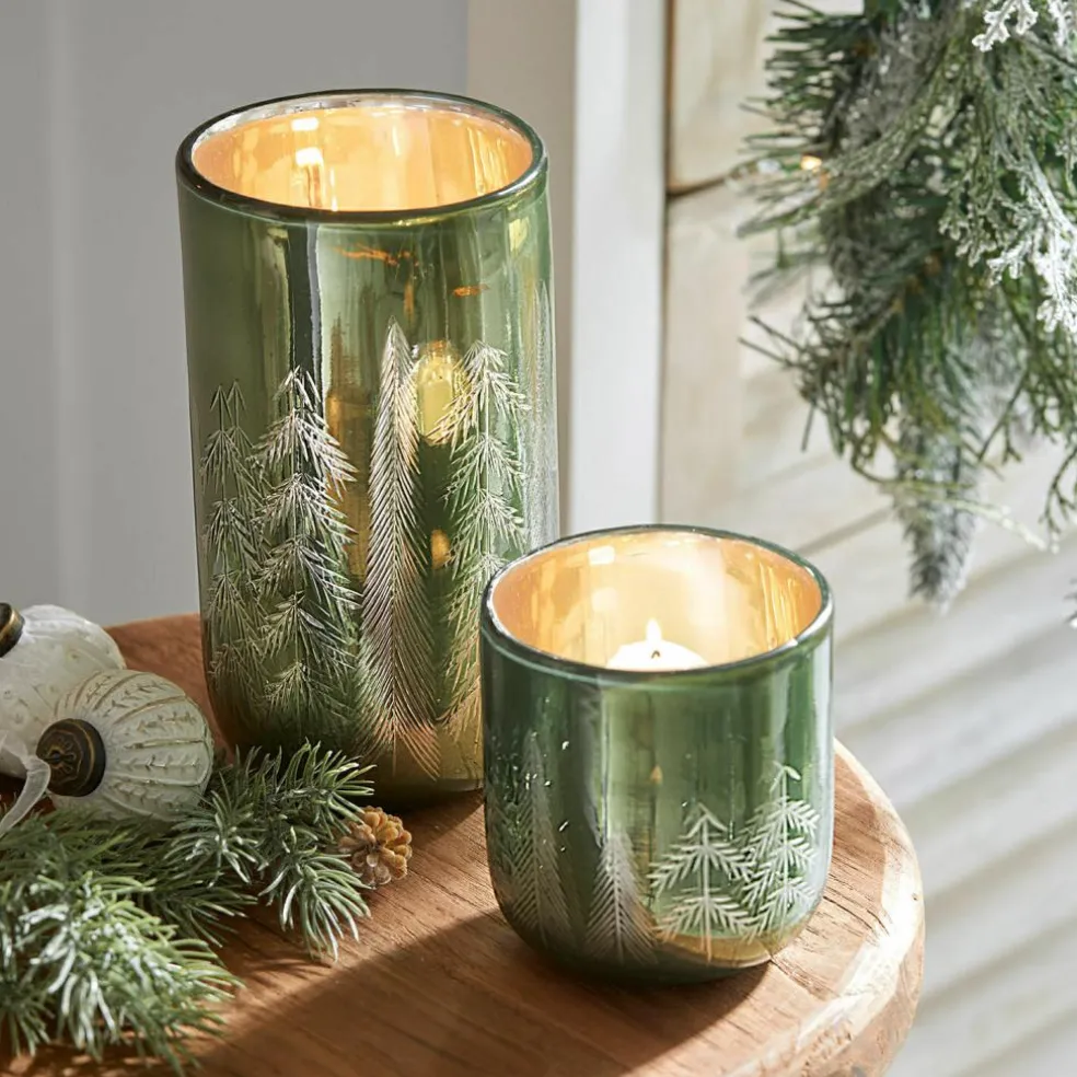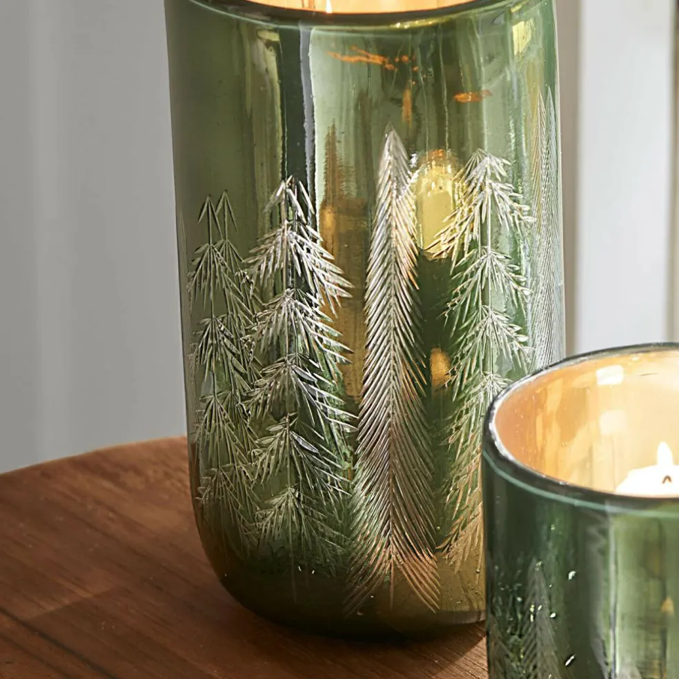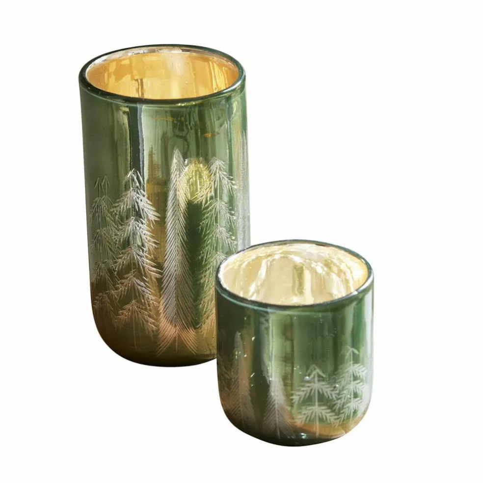 Diese beiden Windlichter wirken, als würden sie eine stille Winterlandschaft in Glas bannen. Ihre tiefgrüne Oberfläche erinnert an dichte Tannenwälder, während das feine, eingeschliffene Baumdekor den Eindruck schneebedeckter Zweige erweckt. Im Inneren schimmert ein warmer Goldton, der das Kerzenlicht weich reflektiert und den ganzen Raum in ein sanftes Funkeln taucht. Dank der mundgeblasenen Fertigung besitzt jedes Glas kleine Unregelmäßigkeiten – charmante Zeichen echter Handwerkskunst. Zusammen ergeben sie ein stimmungsvolles Ensemble, das rustikale Natürlichkeit mit festlichem Glanz vereint.