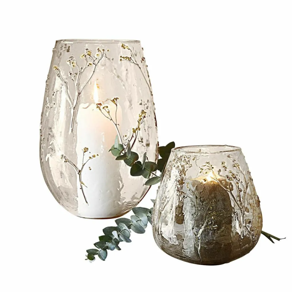 Diese beiden bezaubernden Windlichter haben eine sehr hübsche Besonderheit, denn darin sind zarte Trockenblüten eingearbeitet, die im klaren, mundgeblasenen Glas wunderbar zur Geltung kommen. So zieht ein sehr romantischer Akzent in Ihr Zuhause ein, und Sie können sich auf eine stilvolle Dekoration wie auch gemütlichen Kerzenschein freuen. Da hier echte, getrocknete Blumen verarbeitet wurden, ist jedes Windlicht ein Unikat. Dadurch wirkt das 2er Set auch als Solokünstler in Ihrem Zuhause. Sie brauchen nicht mal Kerzen einstellen oder Blumen hinzufügen. Denn diese Windlichter sind schon Dekoration alleine. Natürlich können Sie sie mit weiteren Accessories herrlich ergänzen, wenn Sie mögen. Als Vasen verwendet, erleben Sie gleich eine doppelte Schönheit traumhafter Blüten. Auch zur Aufbewahrung könnten Sie diese beiden reizenden Accessoires bestens nutzen. Oder wie es der Name schon sagt, als Windlicht mit einer Stumpenkerzen darin.