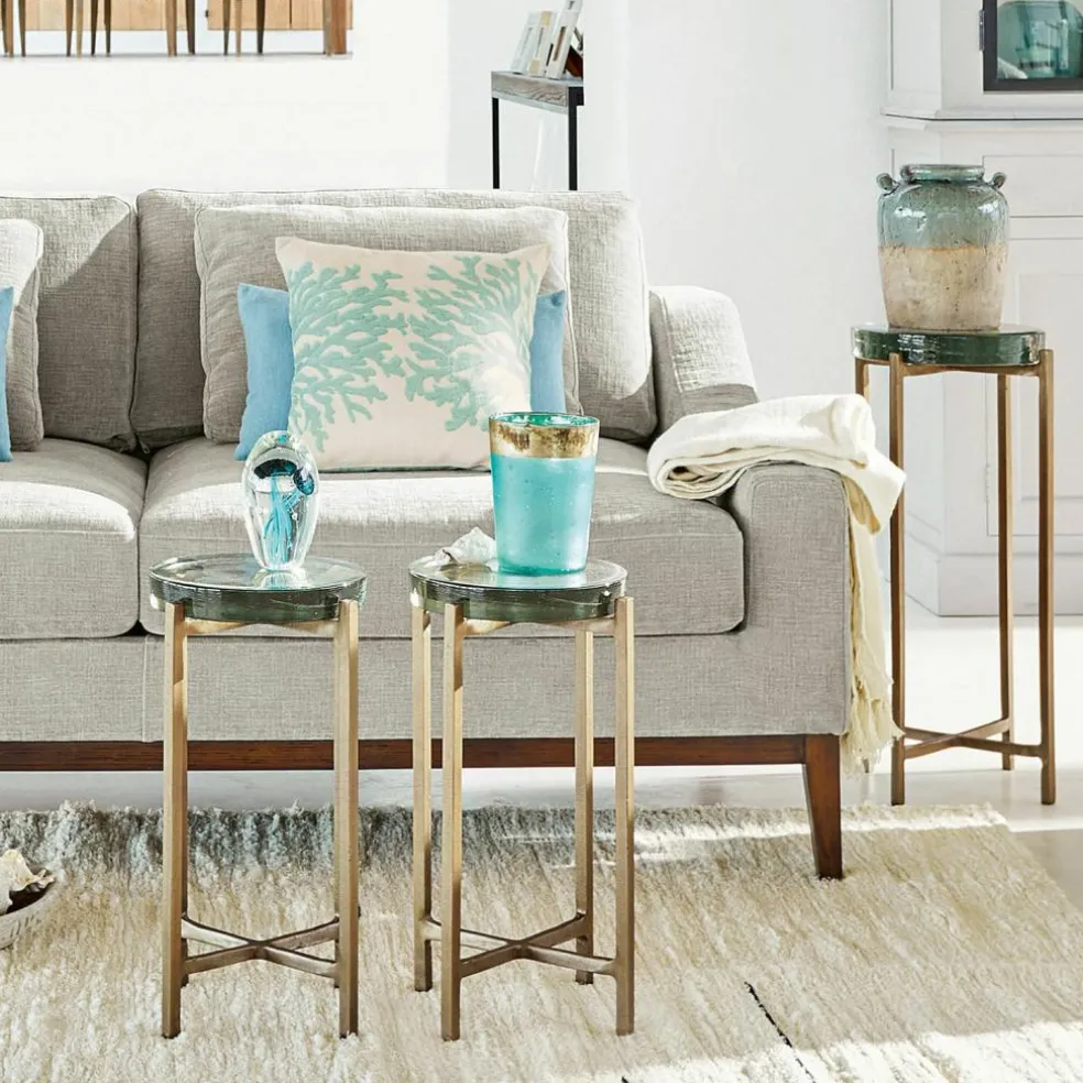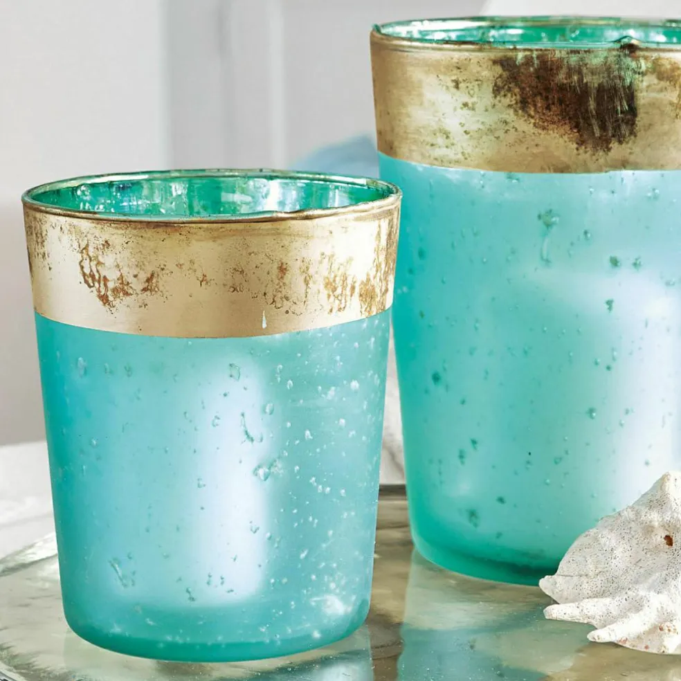 Diese beiden sehr ästhetischen Windlichter überzeugen mit einem reizvollen Mix aus getöntem Glas und bieten ein einzigartiges Antikkupfer-Finish im oberen Teil. Dieses Finish wird ganz individuell angefertigt und verleiht dem Windlich Unikat-Charakter. Das Glas ist zudem mundgeblasen und hat sehr hübsche Bläschen darin, welche ihm eine aquatische Optik verleihen, die an einen Pool erinnern. Sie erhalten zwei Größen im Set. Freuen Sie sich auf gemütliches Licht auf dem Balkon, im Garten oder im Innenbereich, sobald darin Teelichter entzündet werden, oder verwenden Sie die schicken Designs alternativ als kleine Vase. Sie könnten auch kleine Dinge wie Münzen, Stifte oder Haarnadeln darin verwahren und so Ordnung und Dekoration perfekt miteinander kombinieren. In jedem Fall zieht hiermit ein sehr stilvoller Deko-Effekt ein, der charmant jeden Raum schmückt.