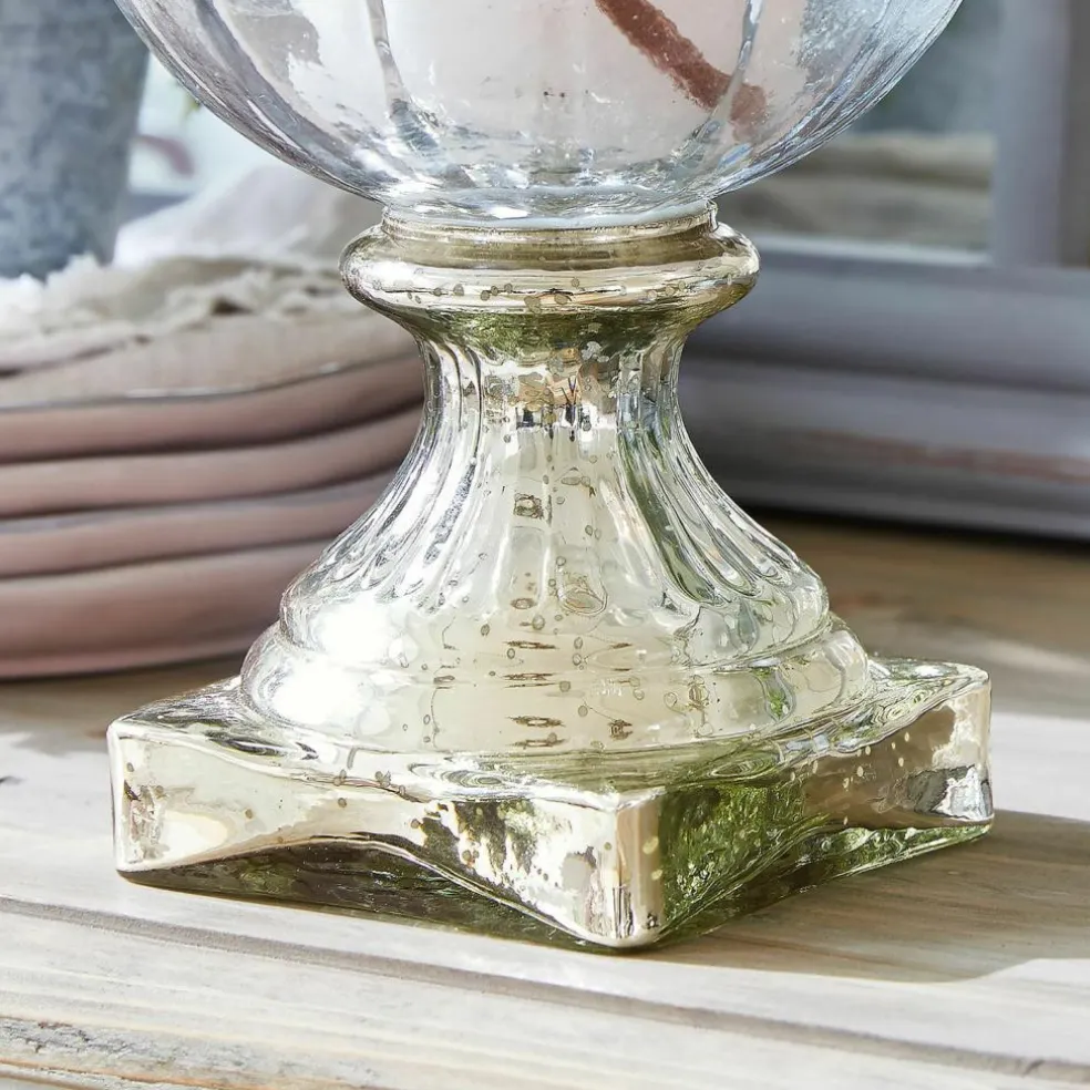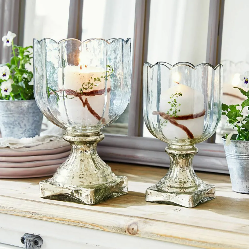 Dieses Windlicht-Set im 2er Pack vereint kunstvolle Handwerkskunst und zeitlosen Charme. Jedes Stück wurde mundgeblasen und überzeugt durch seine individuelle Struktur, die das Licht sanft reflektiert. Die blumige Form der Vasen wird durch den Fuß mit Bauernsilber-Finish perfekt ergänzt und sorgt für einen antiken Glanz, der besonders in klassischen oder romantischen Wohnstilen zur Geltung kommt. Ob als Windlicht für bunte Kerzen, für frische Blumen oder als eigenständiges Deko-Objekt – diese Vasen fügen sich harmonisch in jedes Interieur ein und verleihen dem Zuhause eine besondere Note.