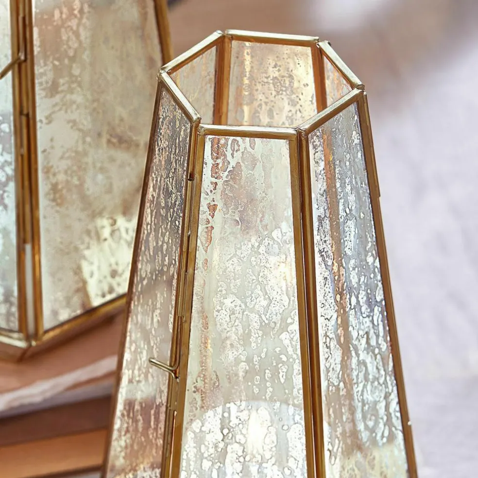 Wie schimmernde Eiskristalle an einem Wintermorgen fangen diese beiden Windlichter das Licht ein – gebrochen, gespiegelt und doch sanft. Die sechseckige Grundform verleiht dem Design eine moderne Eleganz, während das leicht angelaufene Silber der Glaseinsätze Erinnerungen an vergangene Zeiten wachruft. Der warme Goldton des Metallrahmens setzt einen feinen Kontrast zum kühl reflektierenden Glas und macht das Set zum leuchtenden Mittelpunkt Ihrer Dekoration – sei es bei festlichen Anlässen oder als stilvolles Ganzjahresobjekt. Durch die integrierte Tür lassen sich Kerzen einfach einsetzen.