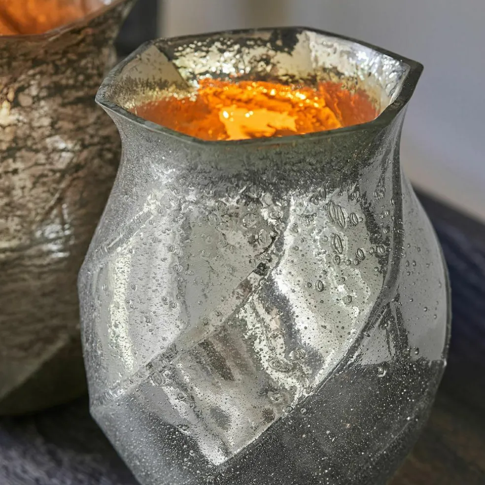 Diese beiden Windlichter erzählen von Gegensätzen, die sich harmonisch ergänzen: Außen rau, innen glänzend. Die markante Struktur des Glases und das zusätzliche Antiksilber-Finish bei der dunkleren Variante verleihen dem Set eine raue, fast handwerklich wirkende Optik. Doch im Inneren offenbart sich ein ganz anderes Bild – die verspiegelte Oberfläche in Bauernsilber fängt das Licht ein und verwandelt es in ein sanftes Leuchten. Ob auf der gedeckten Tafel, dem Sideboard oder der Fensterbank: Diese Windlichter fügen sich stimmungsvoll in jede Umgebung ein und lassen dabei doch nie ihren individuellen Ausdruck vermissen.