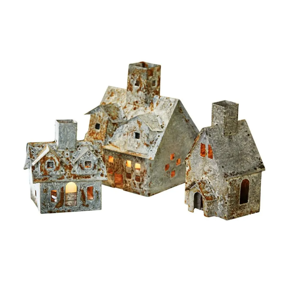 Wie aus einer verschneiten Wintergeschichte wirken diese drei kleinen Häuschen, die als Windlichter jedem Raum eine märchenhafte Note verleihen. Gefertigt aus Eisen und bewusst mit einem Antikrost-Finish versehen, erzählen sie von Vergänglichkeit, Wärme und handwerklichem Charme. Jedes der Häuser ist anders geformt – mal schlicht und zurückhaltend, mal verspielter mit Dachgauben und Schornstein. Sobald das Licht eines Teelichts hinter den kleinen Fensterausschnitten flackert, entsteht ein zauberhaftes Schattenspiel, das an Spaziergänge durch stille Gassen und den Duft von Zimt und Tanne erinnert. Ideal zum Arrangieren im Set oder einzeln als stimmungsvolle Lichtquelle – diese Windlichter bringen eine Prise Poesie in Ihre Winterdekoration.