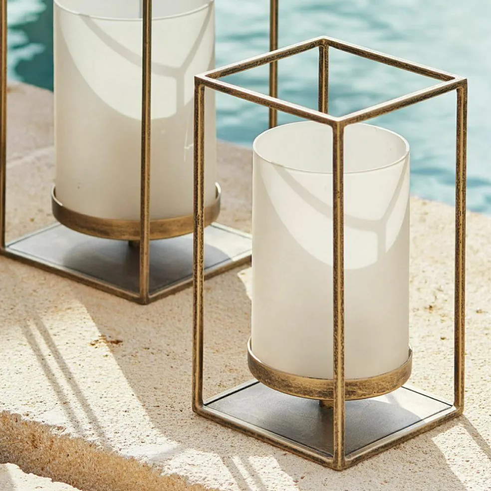 Setzen Sie ein Highlight in Ihrem Zuhause mit diesem kunstvollen Windlicht-Set. Die geometrischen Formen aus feinem Eisen, veredelt mit einem Antikgold-Finish, bringen eine dezente, nostalgische Note in Ihre Einrichtung. Die Glaszylinder aus mattem Glas mildern das Licht der Kerzen, wodurch ein angenehm weiches und einladendes Ambiente entsteht. Ob auf einem Beistelltisch im Wohnzimmer, als zentrales Element auf der Terrasse oder als sanfte Beleuchtung im Flur – dieses Set ist ein Schmuckstück für jedes Zuhause. Das harmonische Trio in unterschiedlichen Höhen bietet zahlreiche Dekorationsmöglichkeiten und lässt sich perfekt in bestehende Arrangements integrieren.