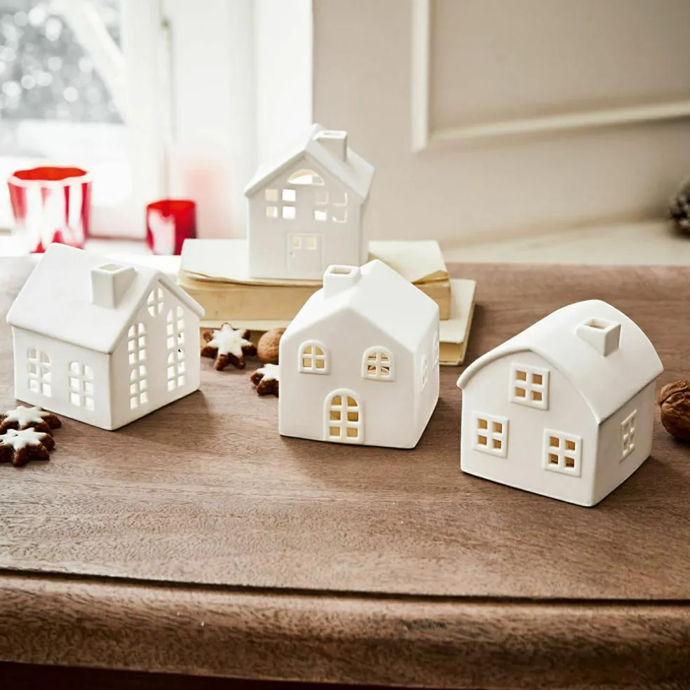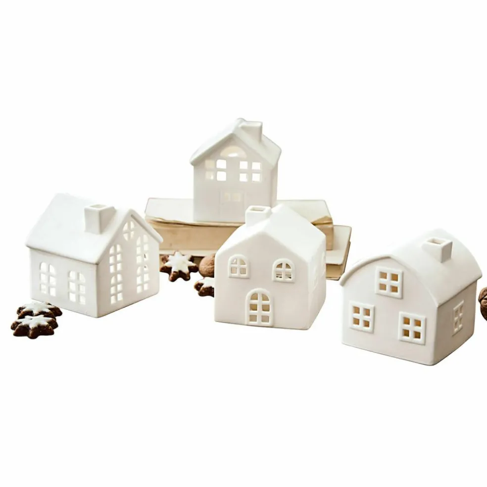 Diese vier wunderhübschen Häuschen aus Porzellan erscheinen wie eine gemütliche Weihnachtsstadt. Wenn Sie darin Teelichter entzünden (exklusive), entsteht eine harmonische und sehr heimelige Lichtstimmung. Auf dem Fensterbrett oder dem Tisch platziert wird es so richtig kuschelig. Die traditionellen Designs schmeicheln jedem Ambiente und verschönern alle vier Jahreszeiten. Zusammen oder je einzeln platziert können Sie sich hiermit auf eine entzückende und liebevolle Dekoration mit viel Charme freuen.